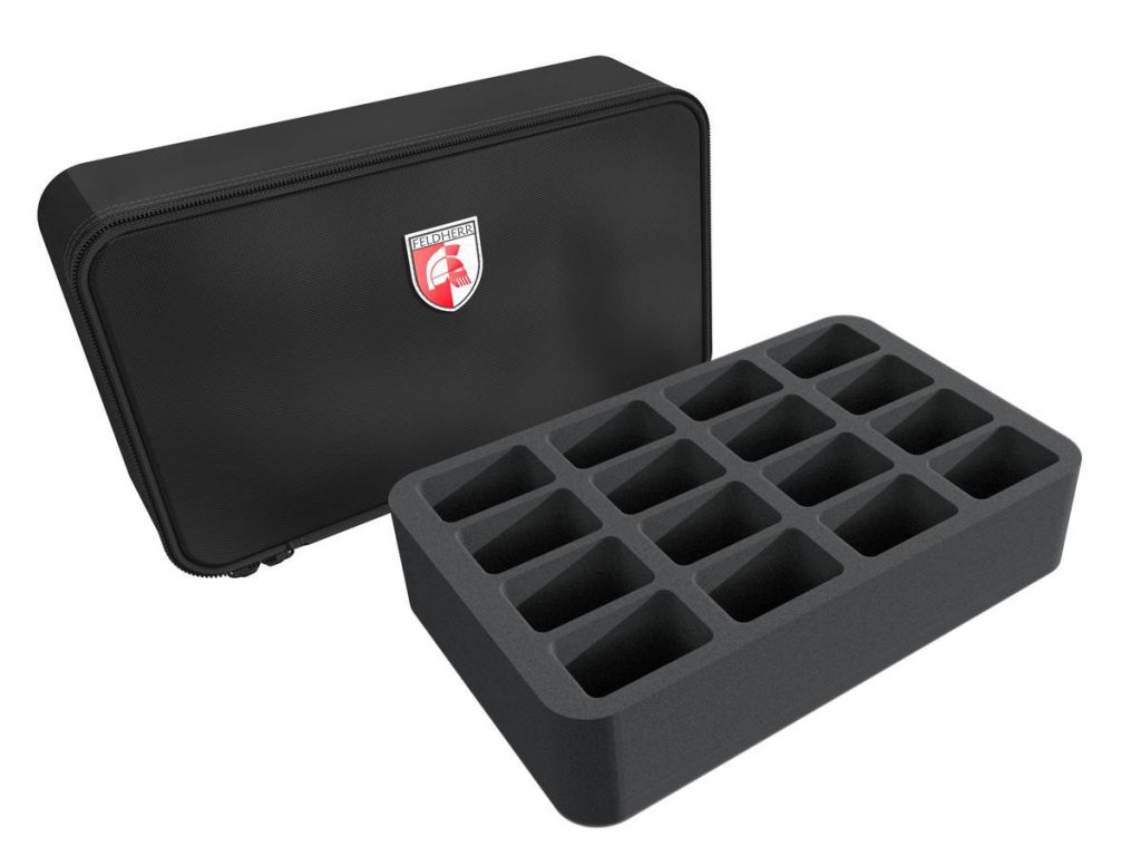Feldherr Mini Case Compatible with 16 Blood Bowl Miniatures - 2016 Edition. Yes, it does say Blood Bowl, but minis are minis! This is a good size for most Necromunda gangs and has plenty of slots for hangers on and extra bits. This fits easily into a backpack and has a zipper pocket for templates and dice as well.