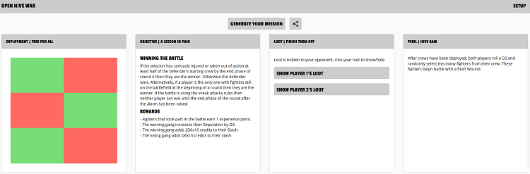 - When generating an Open Hive War scenario, players will draw three cards for Deployment. Each player will choose one card and return it to the deck, starting with the player with the lower Gang Rating. The remaining card will be the Deployment Zone played. Repeat this process for choosing Objectives. Loot and Perils cards will be randomly drawn as normal.