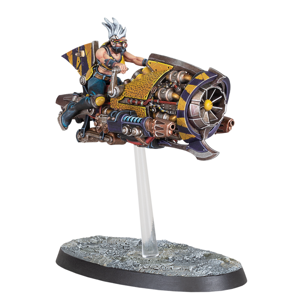 The Escher Cutter is a jetbike Wargear that costs 85 credits plus a mandatory weapon option (75 credits for a twin-linked grenade launcher with frag and krak, 110 credits for a twin-linked plasma gun, or 200 credits for twin-linked heavy stubbers). A 10 credit premium to be able to re-roll the Ammo dice on an overcharging plasma gun is a huge advantage. These weapons do not take up a weapon slot and are considered to have suspensors. Equipping an Escher Cutter also changes a model’s Movement characteristic to 9” and allows them to move freely between levels along with other options. Fighters riding a Cutter also get access to the Deploy Gas Trap (Double) action, which allows the fighter to place a gas trap within 1” of their base and then move up to their Movement characteristic.