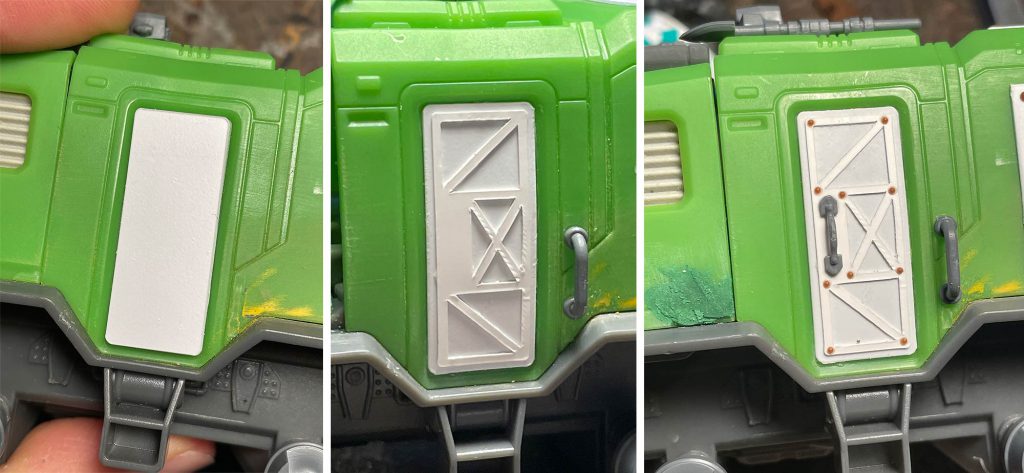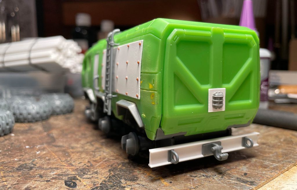 available on my Patreon. So, if you have a Cricut, you could cut your own. The hardest thing about kit bashing toys is the scale difference of small details. The hand grabs and door handles are just too small and don’t look quite right. I used a chisel blade to trim most of these off and to flatten out the side doors to accept my styrene replacements.