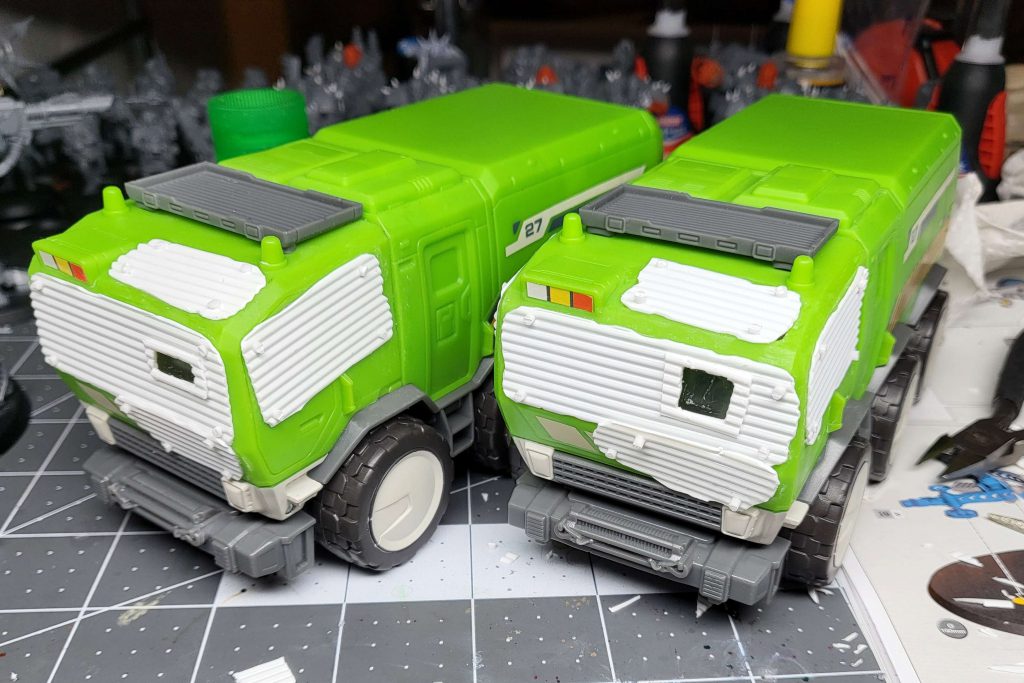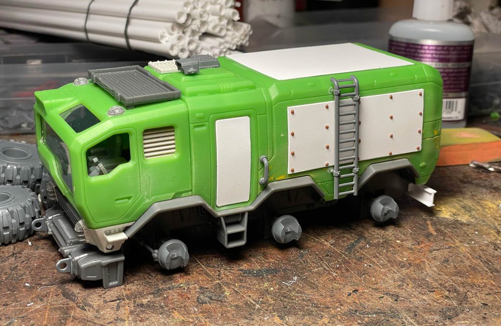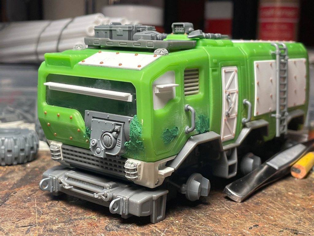 I glued on the plates, added my usual rivets and started detailing. I used hand grabs from the Cargo-8 kit on the body and a ladder from the Baneblade that’s sat in my bits box from 10+ years. I removed the rubber rear bumper and used a length of styrene I-beam to replace it with bits from a Leman Russ to jazz it up. The only downside is that it prevented the rear door from opening fully, so I glued it shut. Be warned! The lights on all sides were replaced with bits from Blood and Skulls Industries. I sanded down a vent from Dragonforge for the roof and added vents inside the cab in the rear windows. I added plates inside the cab for the front side windows and one on the roof window as well. For the front windows I created view ports out of .080” styrene channel and some styrene strip. I grabbed some stowage from the Cargo-8 kit and added it to the roof rack. I used Squadron green putty to fill in the front door handles and the cab lift points.