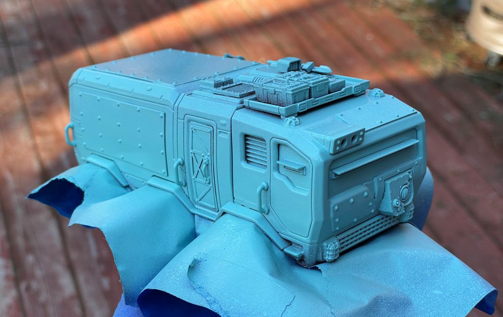 After buying one of these things at Fowler's behest and then hiding it from my truck-obsessed son for weeks, I was reminded that we're scheduled to do something and went to work. My goal was to make something that matched the aesthetic of Warhammer 40k, which tends to feature a lot of big heavy rivets, while also making something that would serve as a viable heavy vehicle. That meant finding a way to put two guns on the thing, and after seeing the firing ports from the