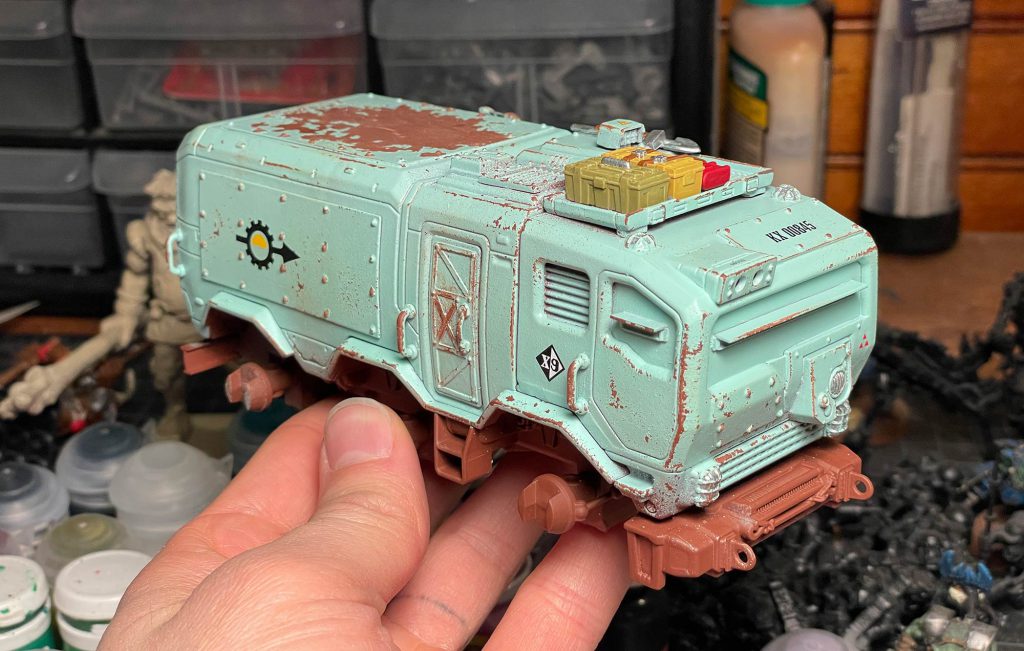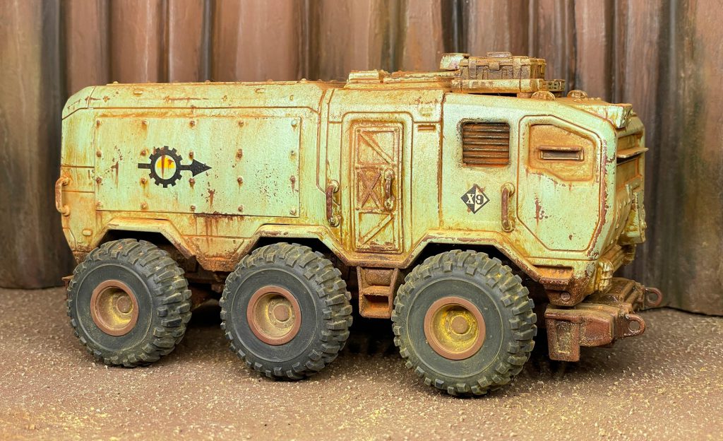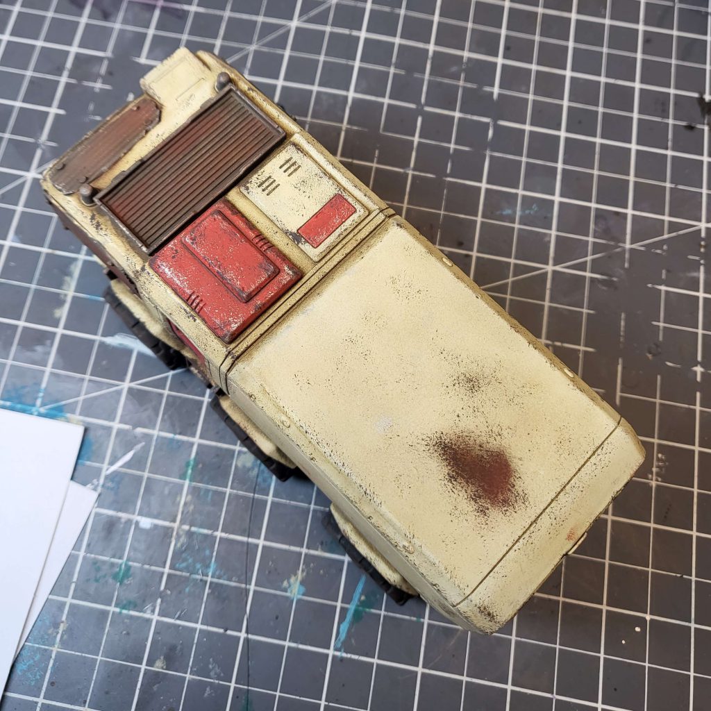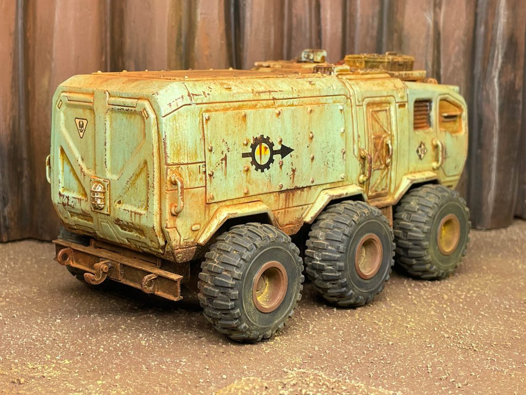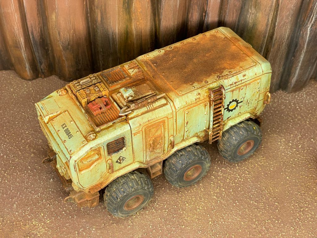 super simple for the paintjob on this one. It's just a bone color basecoat (close to Wraithbone), some details in Mephiston Red, metallics basecoated with Vallejo Metal Color Burnt Iron, and wheels painted with Black Legion contrast. Drybrush silver on metallics and then sponge it messily all over the truck, focusing on edges. Go over that with a sponged pass of Dryad Bark. Even there, it would be more than respectable for the tabletop. I airbrushed Streaking Grime and added some weathering powders to give it a bit more variation.