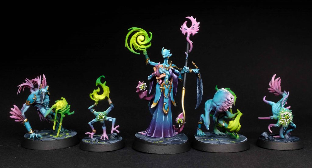 The full splendor of Tzeentch on display with this one! Five models clearly pulled from some of the always-excellent Nicky Grillet’s concept art. The three purely warp-fueled critters are the best “clip and play” chaos familiars in all of GW’s current range (shout out to Silver Tower’s sassy strutting fish) and I don’t think they need to read as purely Tzeentch depending on how you paint them. Beautiful sculpts bringing big warp energy to the table. I wish we had more models in this style.