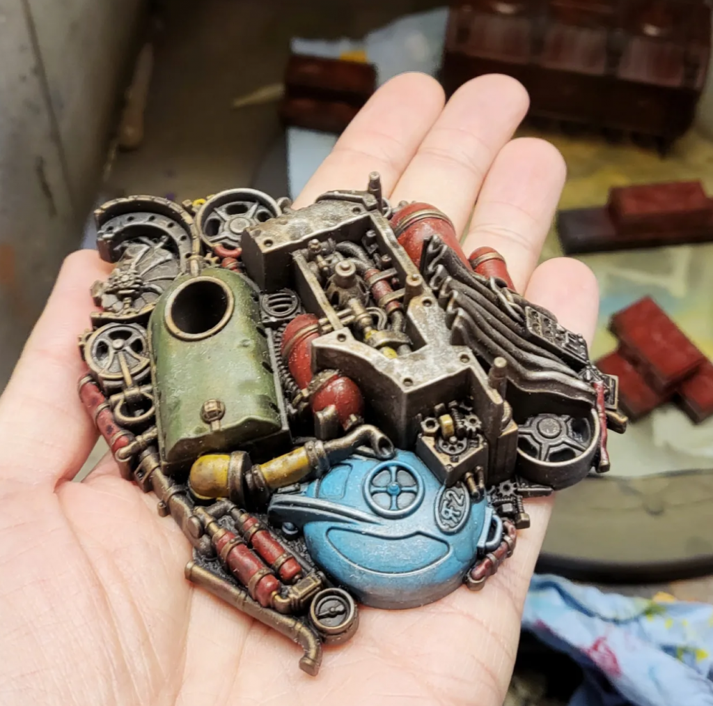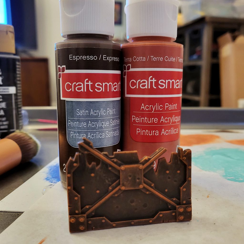a lot of rusty metal, and I made the call to try out some craft paints for the drybrushing assembly line. Craft Smart behaved well when drybrushed on with a makeup brush, and is likely to be the basis for a good majority of anything that isn't getting a bold base color.