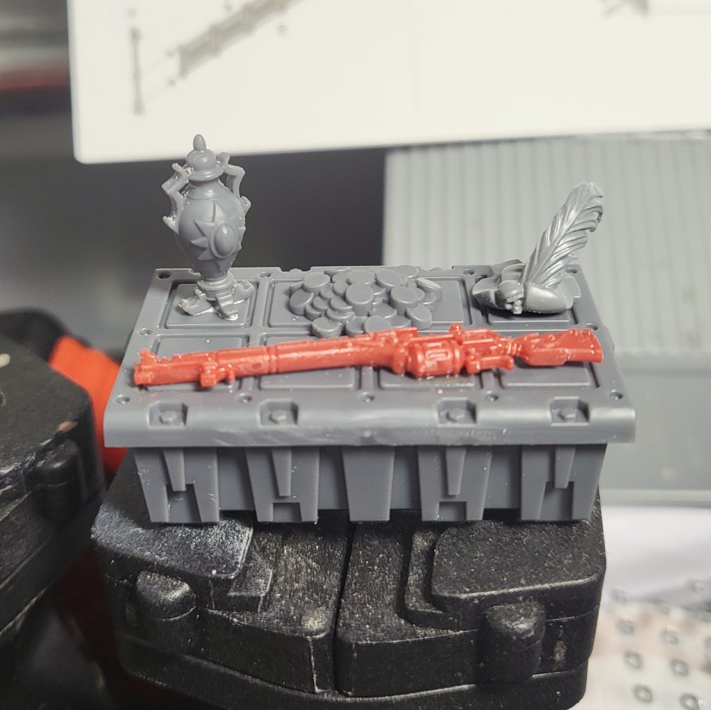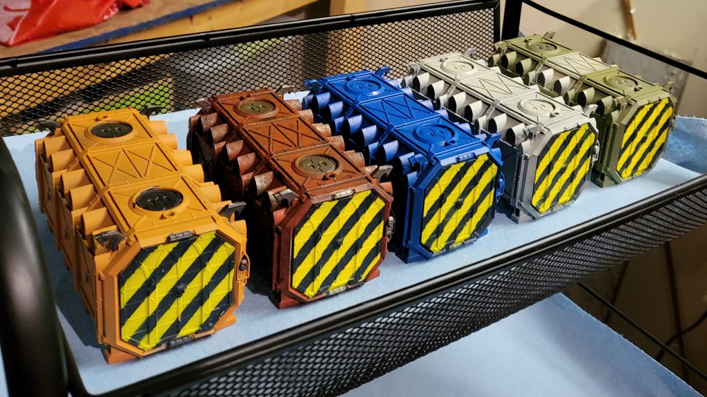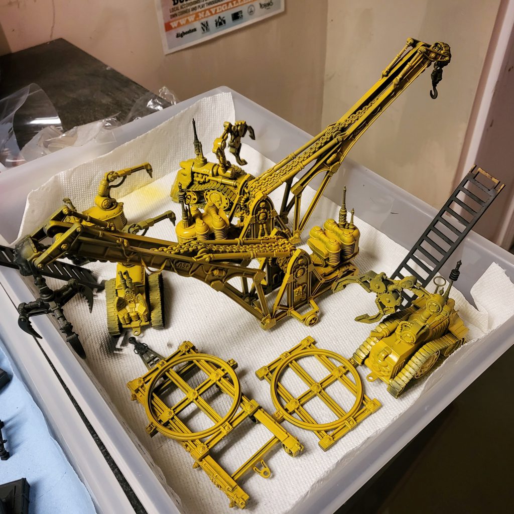 In terms of paint schemes, I have some general themes mapped out. Barrels and crates are going to get a pretty standard box art red. Cranes and some of the other industrial machinery got a base of averland sunset.