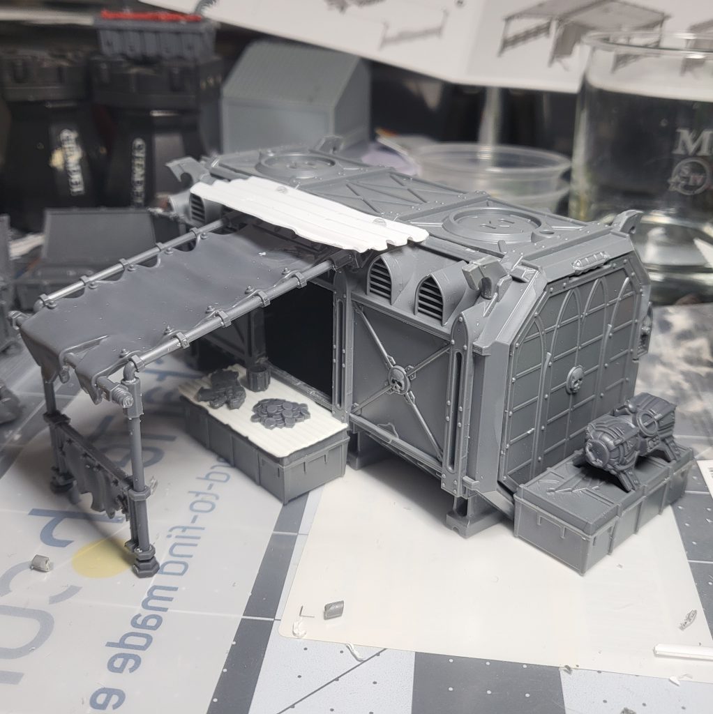 My hillock of shame has quite a bit of industrial scatter in it. Step 1 in this project was clipping, cleaning, and assembling an endless parade of barrels, crates, containers, & cranes. I threw together a few more intricate pieces to represent some shady downhive traders. Even if the action is taking place on Cities of Death buildings, or MDF L-ruins, these kind of bits will keep it feeling more like the Underhive!