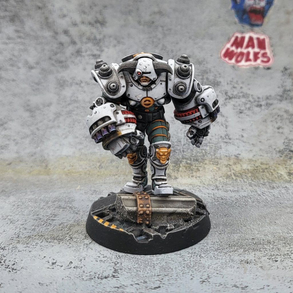 For everyone's favorite punch boy with bolter gauntlets, I decided to work from the base color of my zenithal prime, again leaning on enamel panel liner to add definition. This scheme is another homage to one of the catalog models. The undersuit is Sons of Horus Green, and the tubing is Fire Dragon Bright. While the Orrus is a a slower and beefier hunter, it's made up for with a pair of rather menaching-looking bolter gauntlets.
