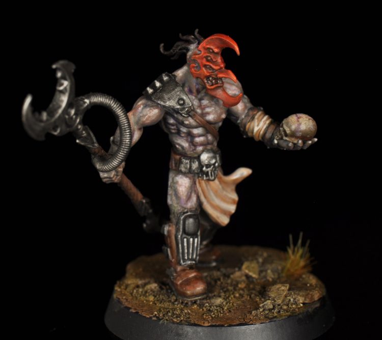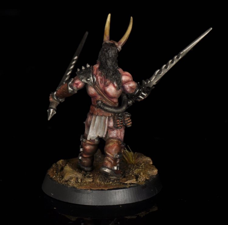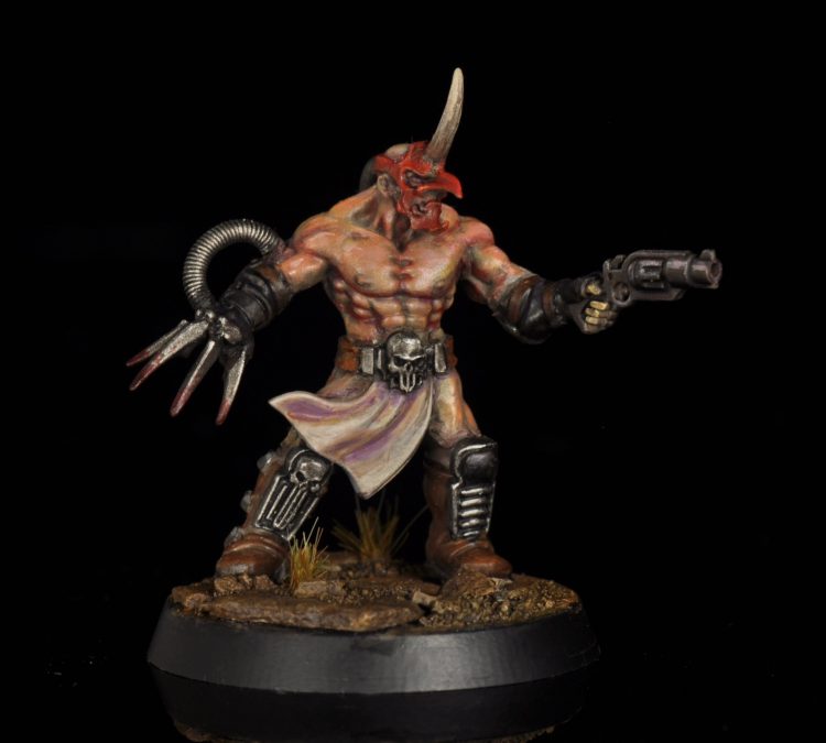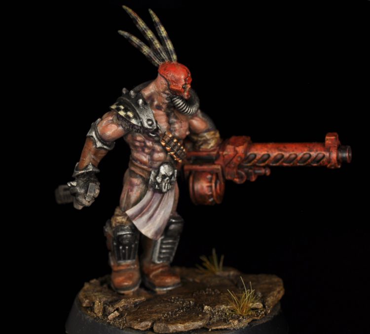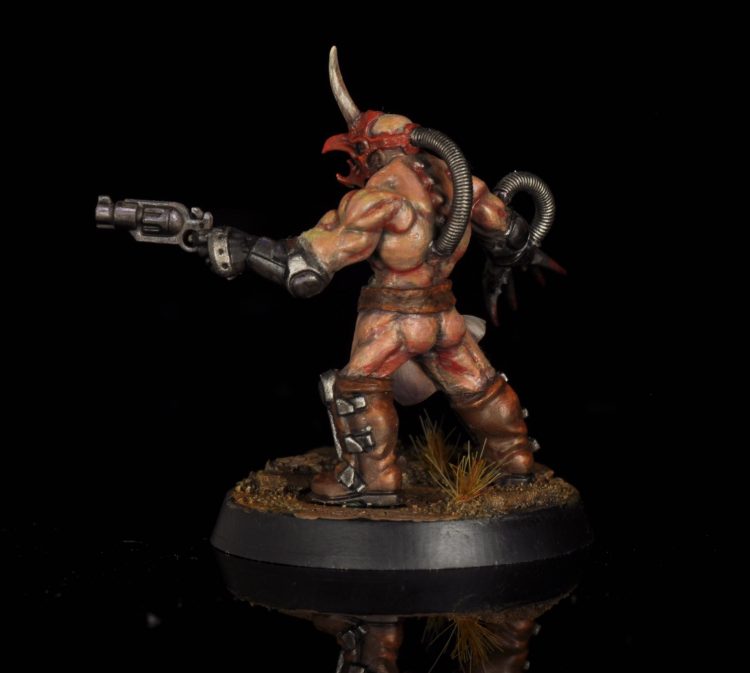 This gang got it’s start as a hobby challenge in a discord. The idea was to combine two kits of basic infantry type models to create a blanchitsu style warband. After browsing through lots of John Blanche artwork I found a couple images of techno-barbarians that became the guiding design principle for the gang. The two kits I chose were Kairic Acolytes and Orlocks. These two kits allowed me to build a fairly close recreation of the inspiring artwork. The acolytes have great muscle torsos and masks that fit the imagery, and the orlocks had the boots and weaponry to complete the picture. This group was initially conceived of as lunatic wasteland raiders. When I came across the Helot Chaos Cult list I found it to be a good framework for the models I had built and inspired some further additions to the group.