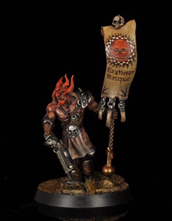 The demagogue is armed with a servo claw and an autopistol. The base model for this build is an AOS Bloodstoker. I have an article on the conversion process
