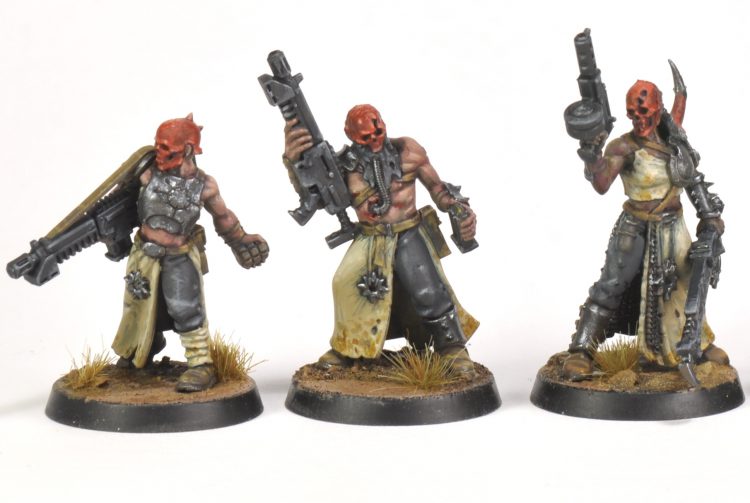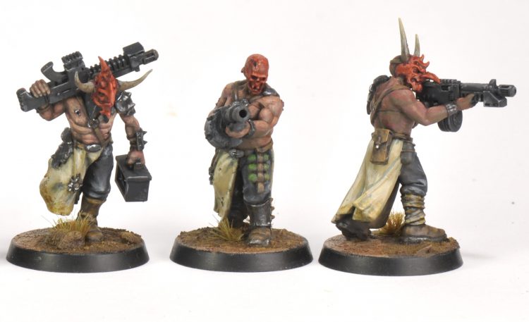 The cultist were the final additon to this band. They bring the gang into compliance with the requirement for at least one cultist per disciple. One has a grenade launcher, one has an autopistol and chainsword, and the rest have autoguns. These are from the Cultists of the Abyss kit with face replacements to make them fit the themes of the rest of the warband. This kit was quite a joy to paint, with lots of good musculature, and a variety of metals, leather, and cloth.