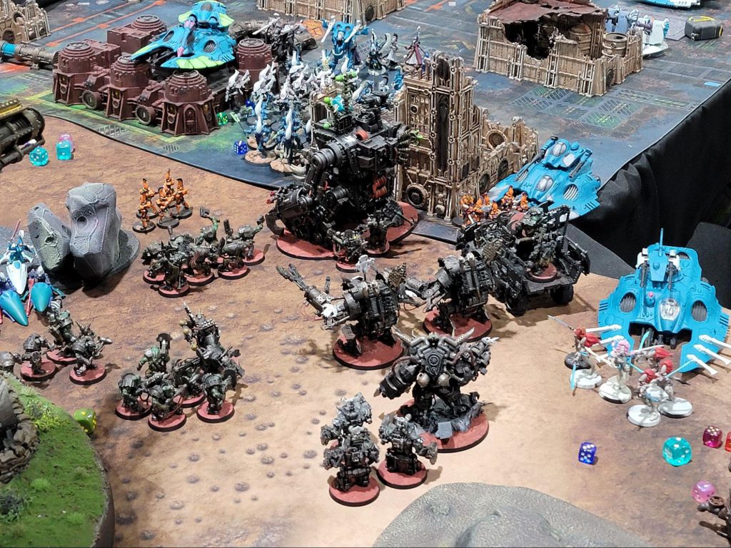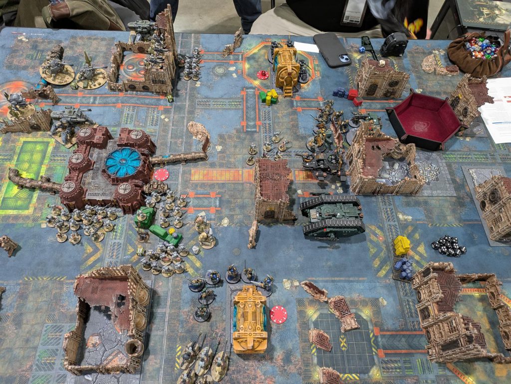 Now the good news. I’d like to really praise the organizer and players of this event. One of the rules he had instituted was a reinforcements ability for all armies to bring back all unit types for both alliances for the first 3 turns. I was pretty nervous hearing this as usually things like this can lead to extreme time overruns, but he did a fantastic job of keeping people focused and set very rigid turn time limits to keep the game on a reasonable schedule while also ensuring nobody got knocked out turn 1. Shoot what matters, fight what’s worth rolling, good stuff.