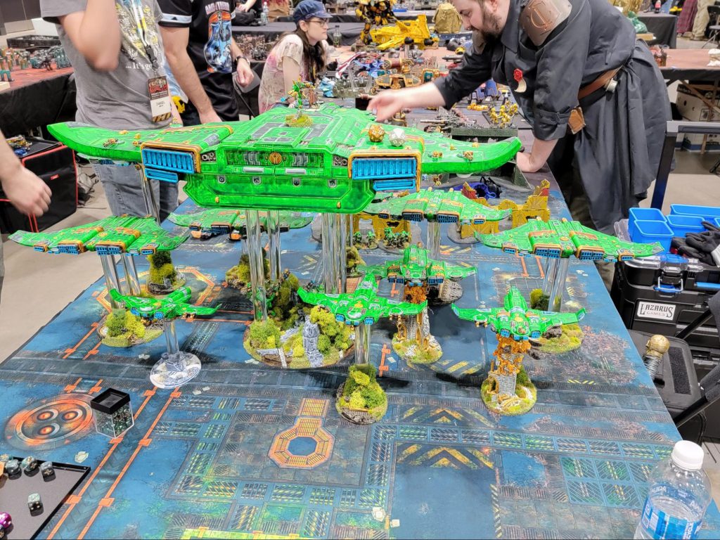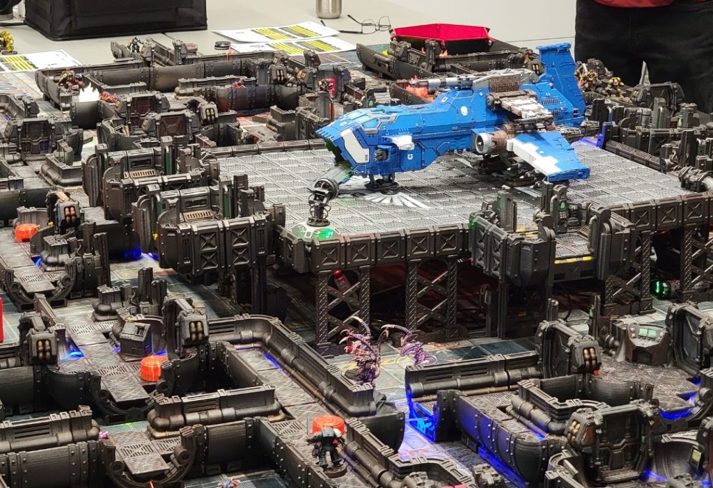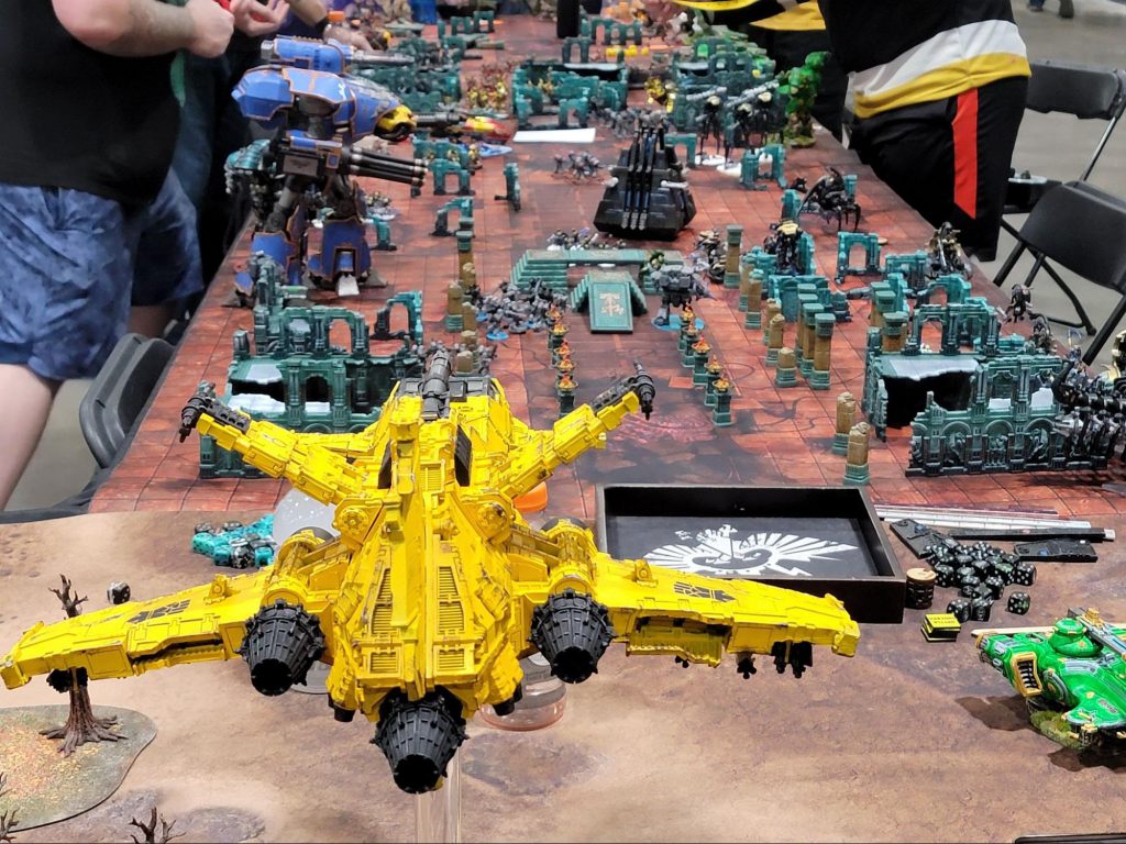 The players were super open to just doing cool and cinematic stuff. At one point early on there was a large Tau air wing featuring a Manta wrecking up the Imperial alliance on a table. Seeing that their forces were just not up to the task, the players of both teams agreed to have a desperate deep strike attack occur with Terminators and jump pack marines deployed into melee along the back of the Manta to try and bring it down. When they finally did, the players would roll to see which models escaped the ensuing crash.