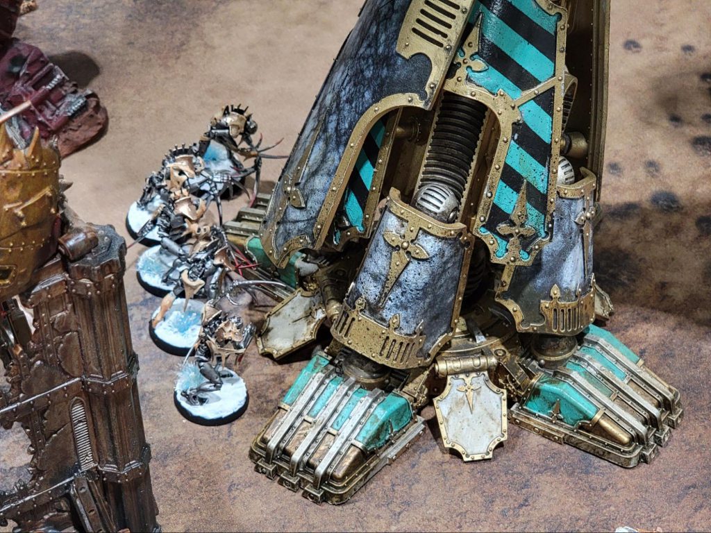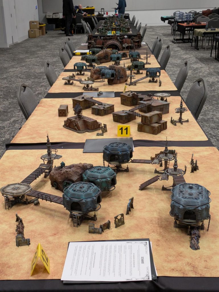 Each turn the organizer would update the teams on Narrative story updates as different objectives were taken and lost, lending a bit more investment into both tables (TWO wars?) and the fun apprehension that comes from not knowing if hell is going to be rained upon you or if the eyes of the gods will turn upon your enemies. To cap everything off at the end of the final turn, all Titanic units were permitted one final round of simultaneous shooting, with all units that died automatically triggering Deadly Demise.