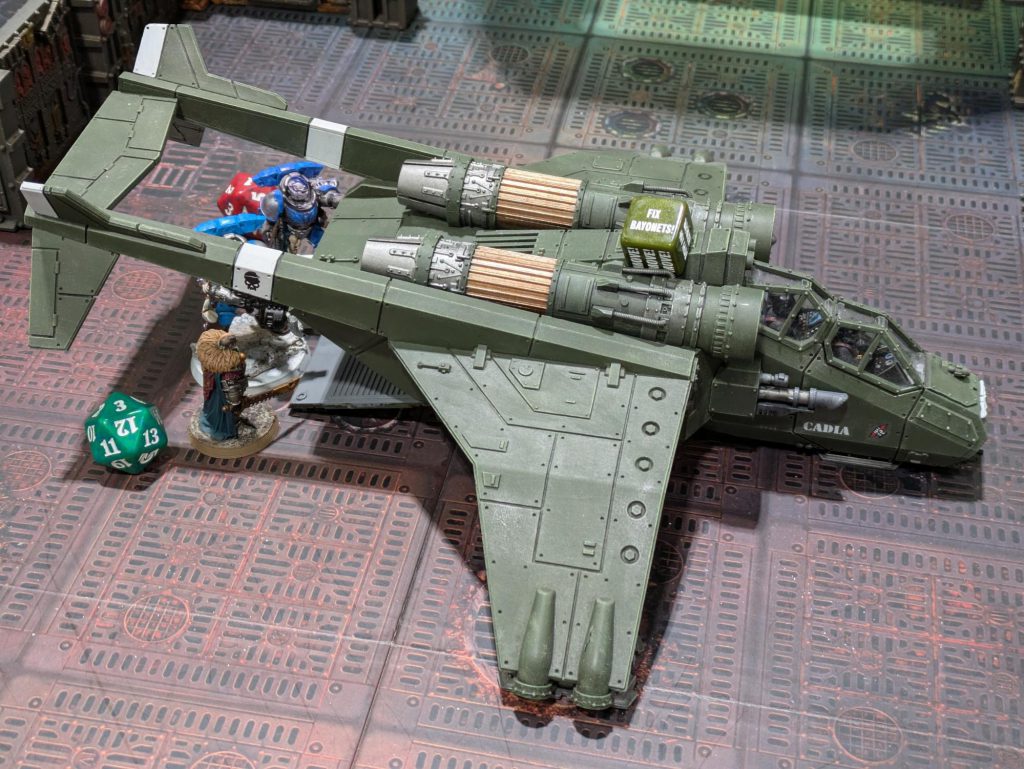 What he isn't expecting is that the traitor Valkyrie must be possessed by a Bloodletter or something, because it furiously slams its gangway into the Admiral’s head repeatedly, coming within one command point rerolled 4+ save of crushing him. Did you know in Boarding Actions an Astra Militarum officer can issue an Order to any friendly Astra Militarum model regardless of other keyword restrictions? Fix Bayonets, Valkyrie!