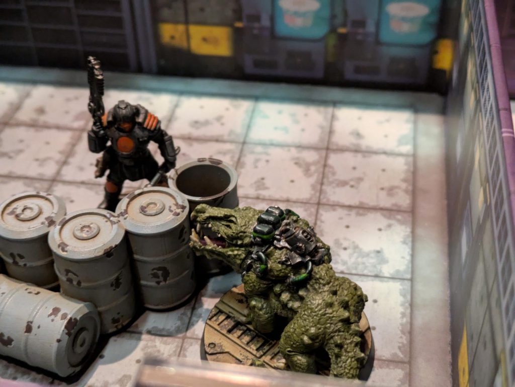 Andrew: The beauty of Necromunda is it elegantly combines two very different tones. The first is the gritty combat atmosphere you might see in something like Saving Private Ryan, with the The Sauce desperately holding his shield into the door way while genetically enhanced monstrosities and a sewer monster rage and batter at his faltering defense. To his side Jim lies with his back against the wall, checking his boltgun only to realize he’s out of ammo and he knows from how much blood he’s lost that he’s not making it back to base. Two brothers in arms fighting until the end. And then while all that’s going on you’ve Mickey and Jim both pushing the door button as fast as they can like a Looney Toons cartoon. Necromunda contains multitudes.