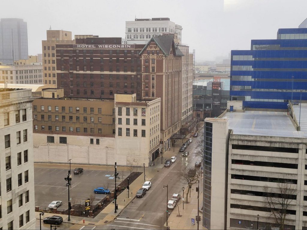 On Saturday Milwaukee was sunny and 72° F, but this morning it is 34° F and lightly raining. In a perfect world we’d take the skywalks from the Hyatt through the Baird Center to the Hilton to stay out of the weather as long as possible on the way to the Amtrak station, but the Baird Center has security with bag checks and we don't want to drag all our luggage through that line. Besides, it's not raining very hard, and the forecast has the rain ending soon.