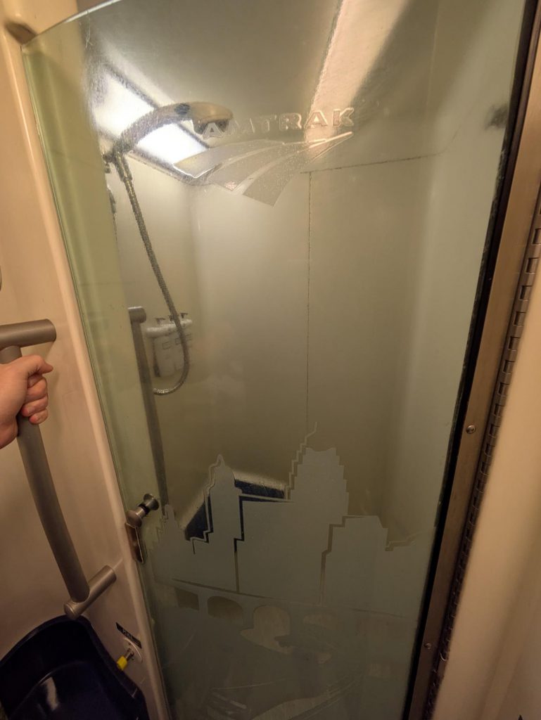 Our chariot for the ride back to Marshall is pretty similar to what we had on the ride up, except this time our roomette is in a Superliner 1 instead of a Superliner 2. Besides being about 45 years old instead of 30, the only noticeable difference is that the downstairs area trades one of the bathrooms for a bigger shower area. Such luxury.