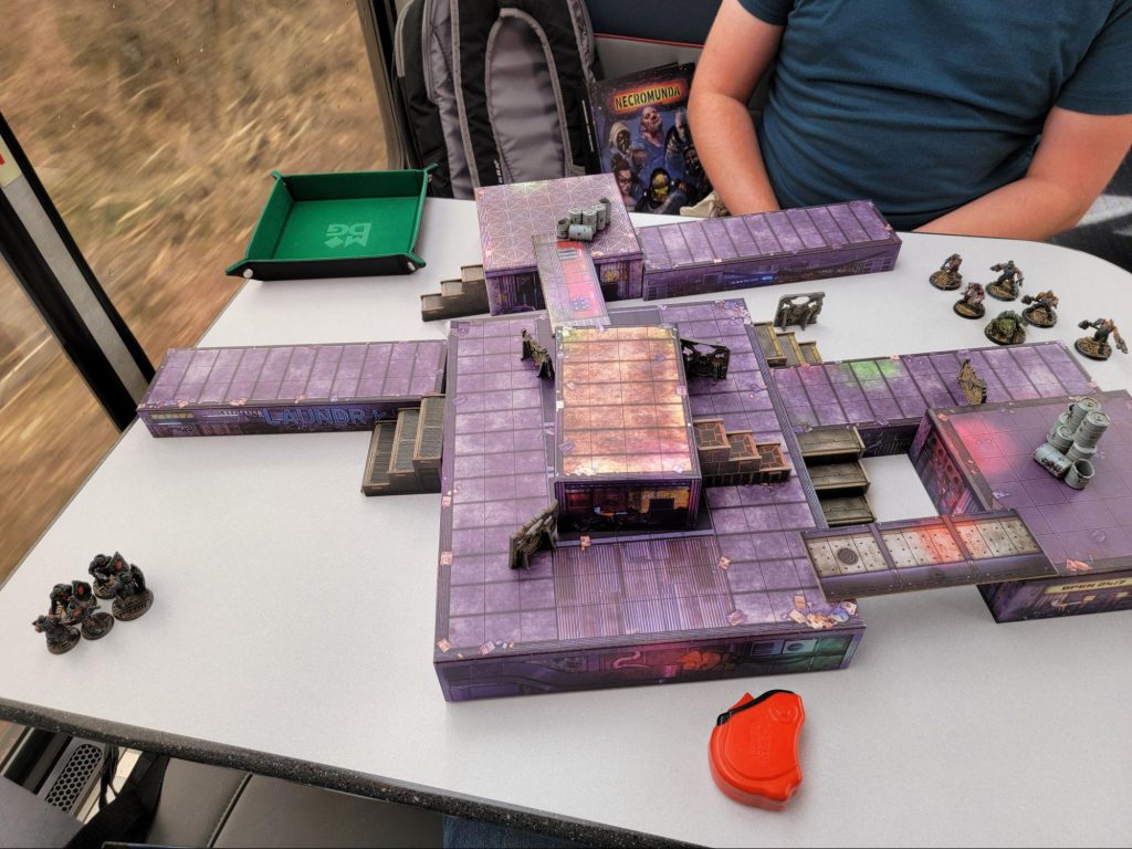 Greg: You definitely want a dice tray on a train. Some sticky tack to keep the Necromunda barricades from tipping over wouldn't have gone amiss too. Those things tip over easily on a fully stationary table, the Train Life is not easy for them.