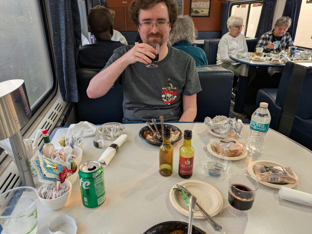 Greg: I’m pretty sure part of the goal of Amtrak’s dinner menus is to make sure you're good and sleepy for when it gets to 10 pm quiet hours. Sleeping on a moving train is tricky, but eating a roll, pasta, beef, a brownie, and two glasses of red wine sure gets you a head start on it.