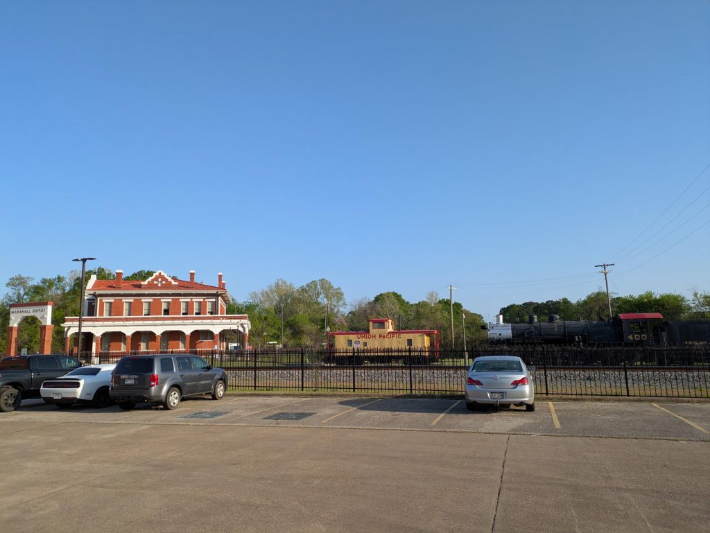 The Texas Eagle pulls into the Marshall station, and we pile out after tipping our sleeper car attendant. The train pulls away within ten seconds of us stepping off of it. Got to make up that 30 minute delay, I guess. We watch it leave before hiking over to the parking lot and Andrew's car.