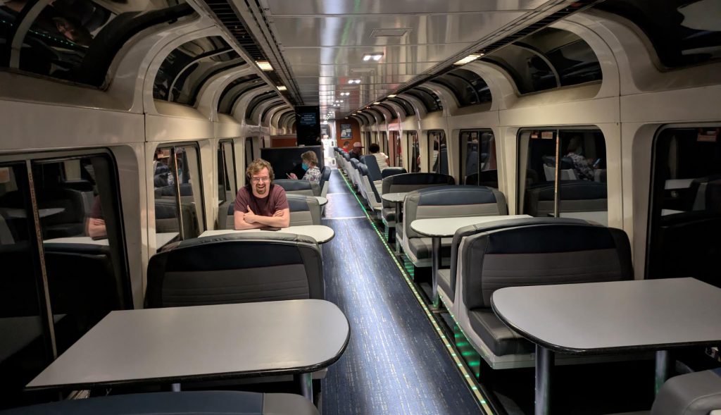 That connection is now a bus, because the 35 year-old cars used on our connecting train have developed severe corrosion and have been taken out of service immediately and indefinitely. The 2021 infrastructure bill funded the replacements for these cars, but some of the old ones were still in service, and our scheduled train happened to be made of them. Infrastructure Week came a couple years too late for the Horizon coaches, I guess. The station staff herd a train’s-worth of people onto three buses, and off we go.