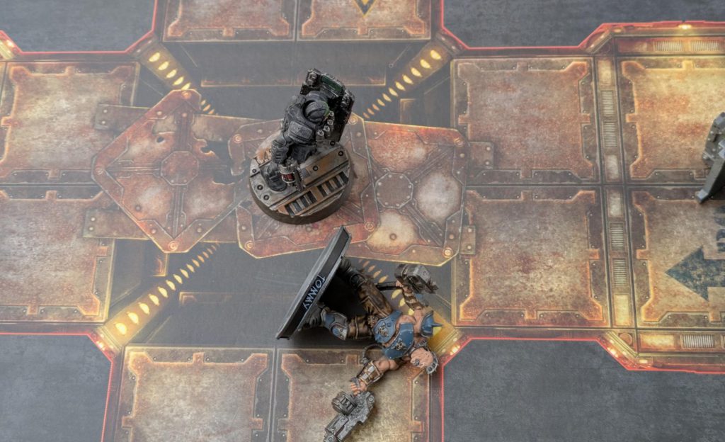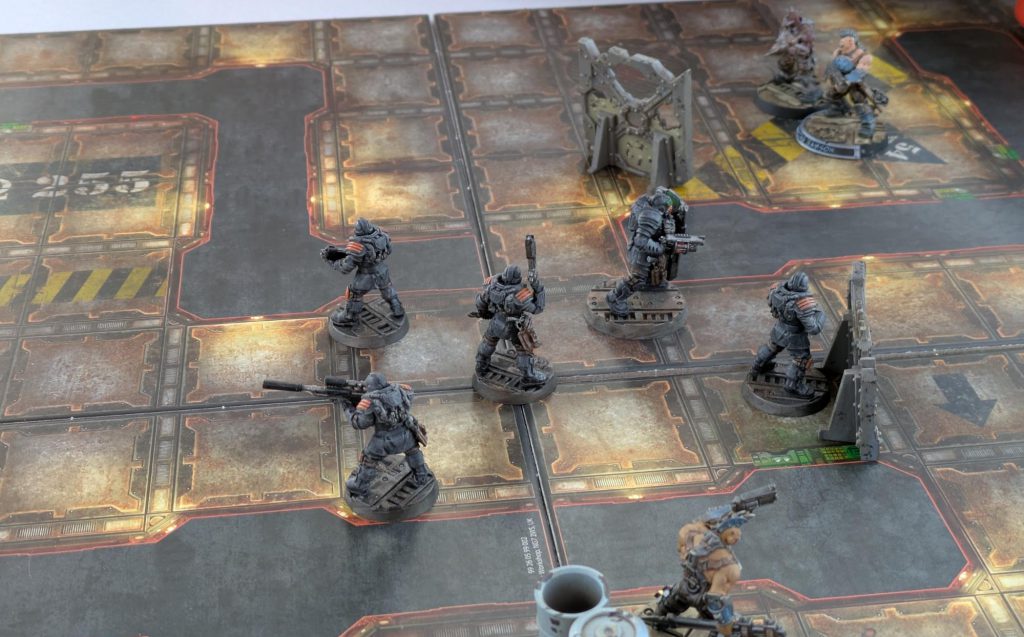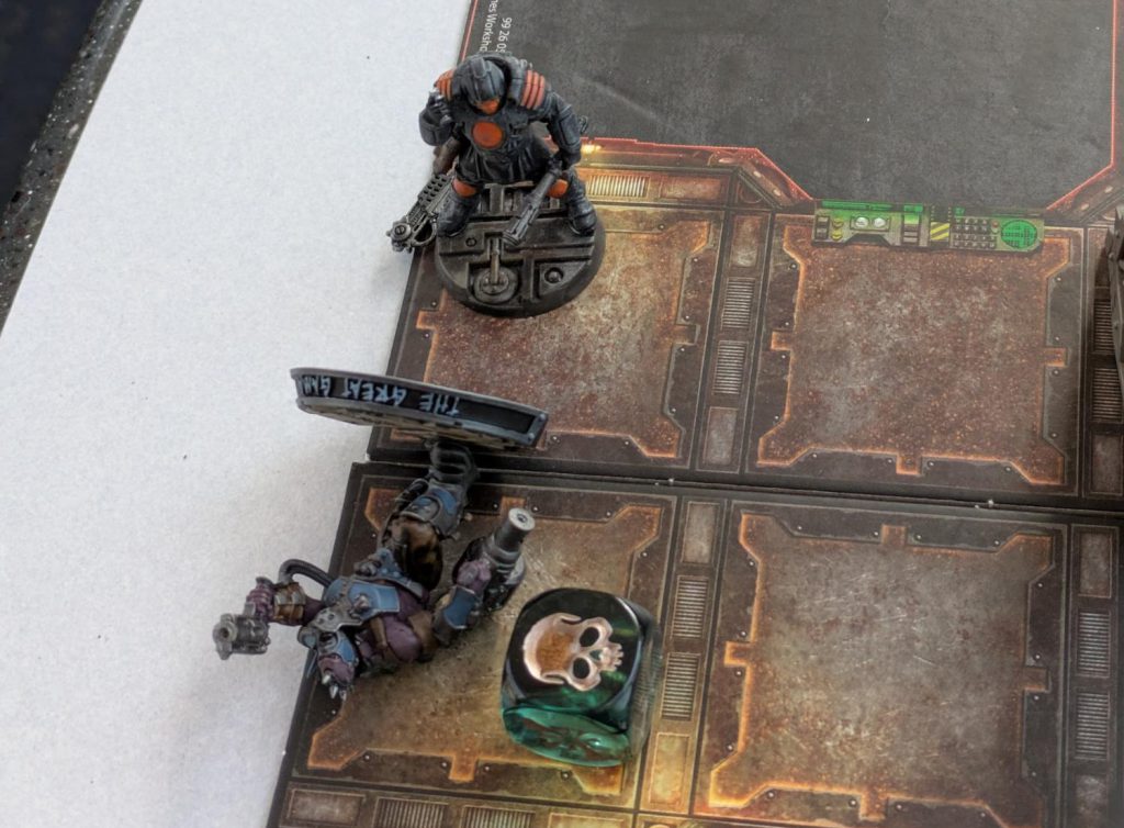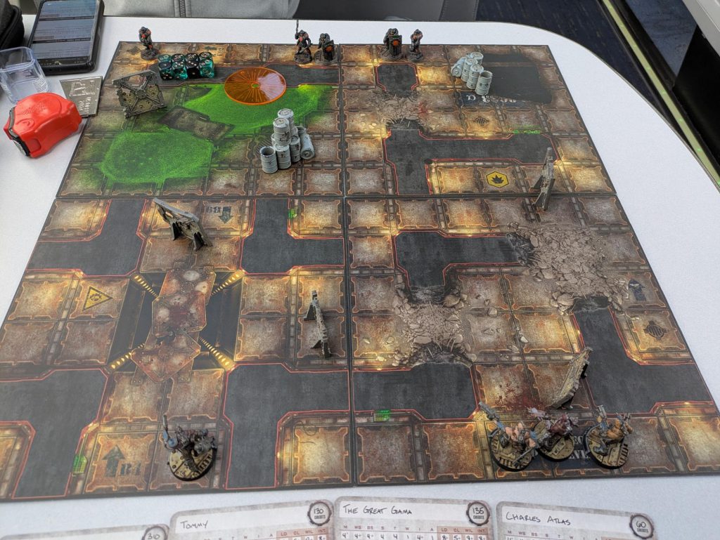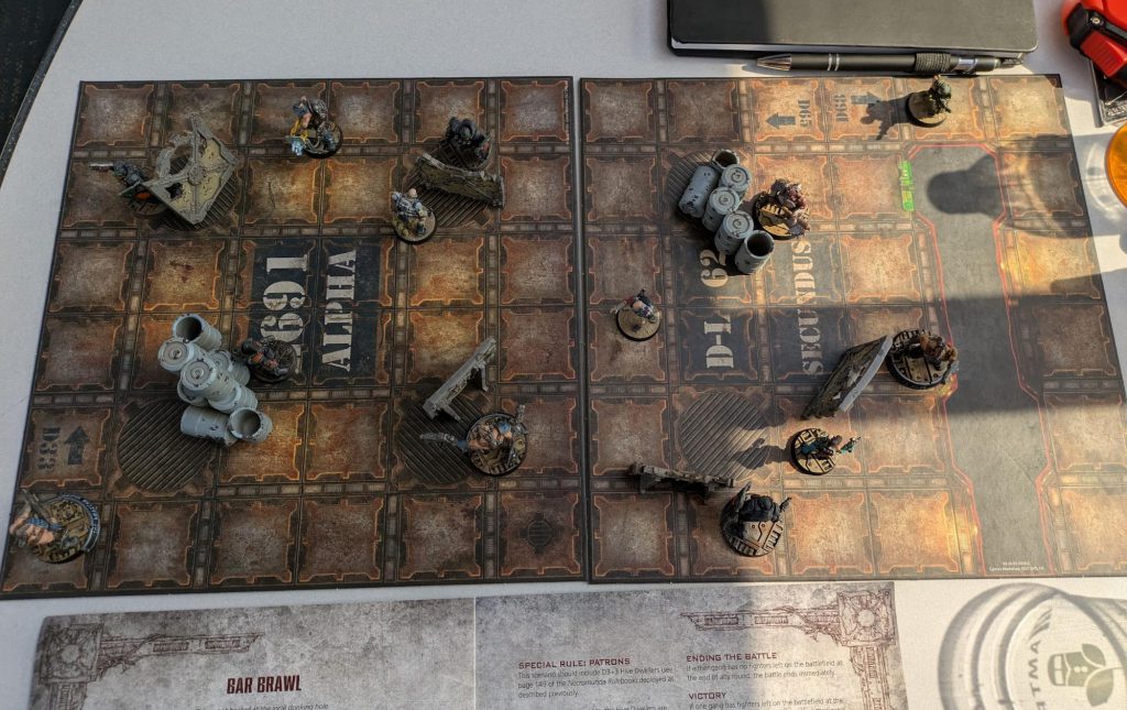 Greg: We’ve got time for one more round of Necromunda before we need to pack our bags and transfer in Chicago, so we just toss out the missions and do a straight shoot ‘em up. We flip all the tiles over to the sides with extra hazards, and we give the Enforcers an extra ganger to try to even the odds.