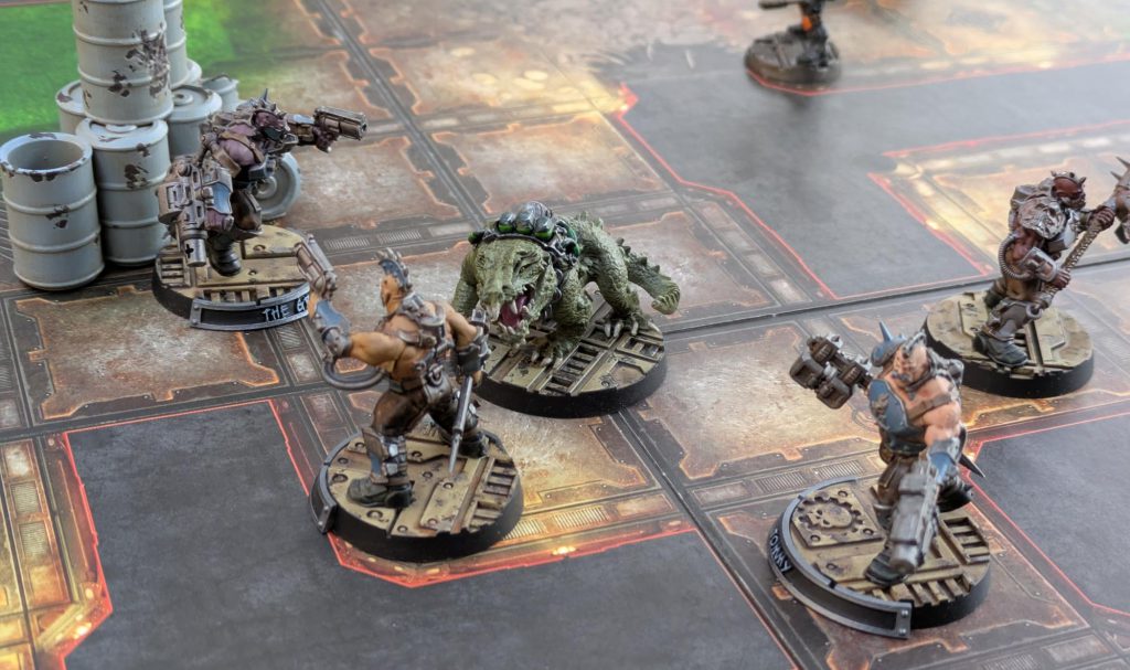 Greg: We have hit a snag in my Necromunda plan: The remaining Gang Raids missions use more than a 2x2 tile grid and would be difficult to fit on the lounge car table. We end up deciding to replay Clandestine Rendezvous with the sides flipped. The “corrupt Enforcer” is now my Sumpkroc, Periwinkle, who has been accused of mauling a scummer and is wanted by the law.