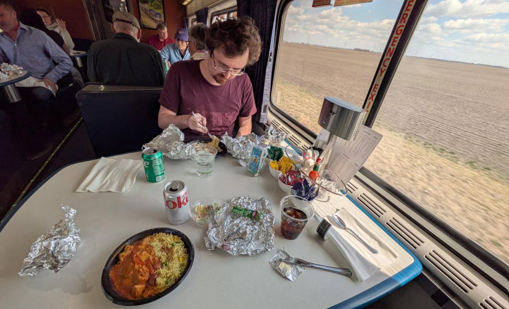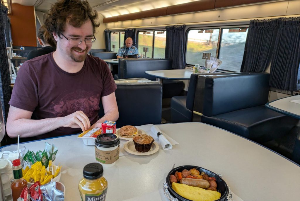Time for breakfast. The Texas Eagle has the “Flexible Dining” menu, which is a euphemism for “microwave meals instituted during the pandemic as a cost-cutting measure.” My omelette and Andrew’s continental breakfast are fine, but I’ve been on trains with the “Traditional Dining” menu and it's hands down better.