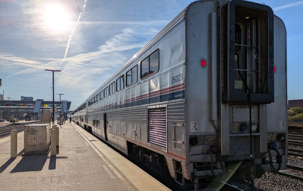 Greg: Between St Louis and Chicago the state of Illinois paid to upgrade the freight tracks to allow 110 mph speeds for large sections, and I clock us hitting 103 in our giant double decker Superliner. Hell yeah.