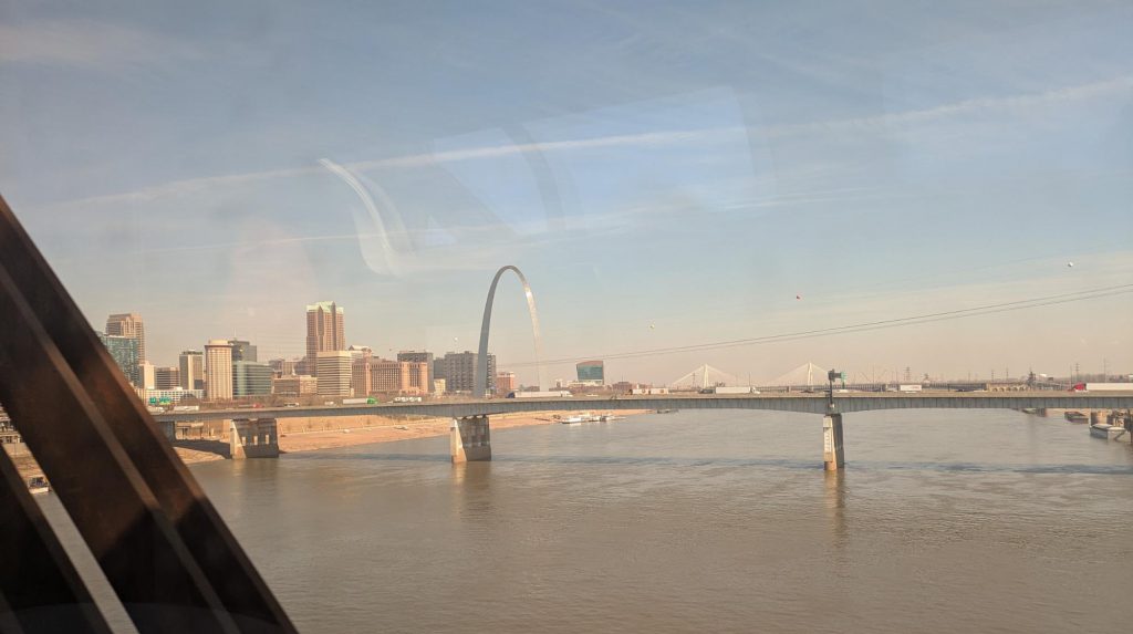 I wake up in Arcadia Valley, Missouri, right around 6:15 AM. Six-ish hours of sleep on a moving train is a win in my book. The train is still running on time; we’ve averaged almost 60 mph while we slept. I head to the lower level of the car and take a shower while the train bounces along at 75 mph, which is exactly as undignified as you’re imagining. It’s great. Andrew refuses to attempt the Train Shower, which is uncharacteristic cowardice on his part.