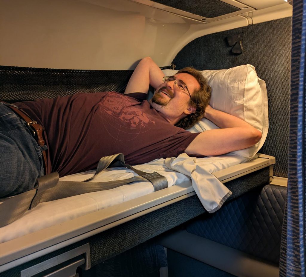 We are booked in a roomette, which in nighttime configuration is basically a bunk bed with a door. It's not glamorous, but it's a bed, it's private, and by booking a sleeper car we guarantee we’ll have hot meals and a shower. Our Superliner 2 car is about 30 years old, but at least it's received the recent updates to the upholstery.