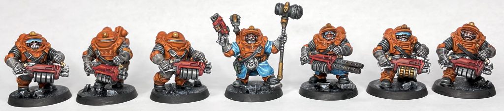 This 40 credit crew option is pretty standard, with a 4+ BS and other stats that you’ll almost never roll between 6+ and 7+. They have access to custom vehicles, the Ridgerunner, Rockgrinder, and Wolfquad, and of course the Squat-specific vehicles with the Skalvian Explorator and the Svenotar Scout Trike. Pistol wise they get access to the Ironhead version of the autopistol, bolt pistol, and stub gun as well as the usual wargear of filter plugs, photo-goggles, and respirator.