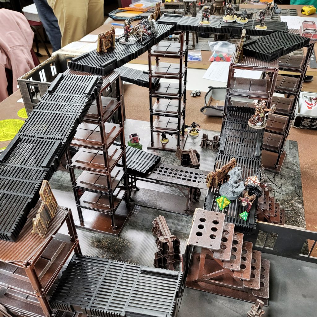 The table you see above is made up of random MDF stairs & walkways someone left at my game club, some children's construction toy set, five bucks worth of aquarium undergravel filter boards, and scatter. Maybe it's not the prettiest table, but it played host to absurdity that I will never forget. A dude fell off a gantry (taking a max strength fall! hit); landed on and killed one of his teammates... but managed to walk away like nothing happened. Pure Necro dirtbag magic.