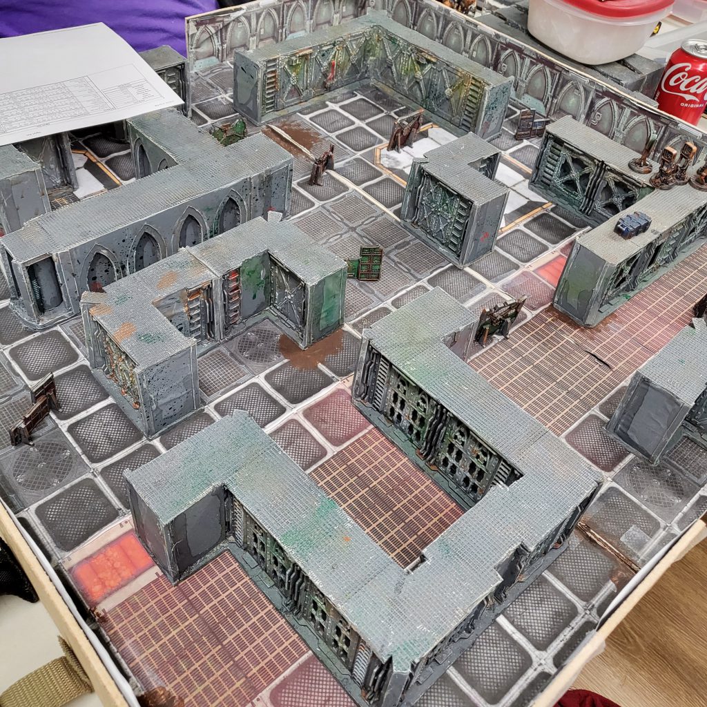 righteous Necro a table from a tournament-ready 40k setup; squished into a 3x3 or 4x4, with some walkways and scatter.