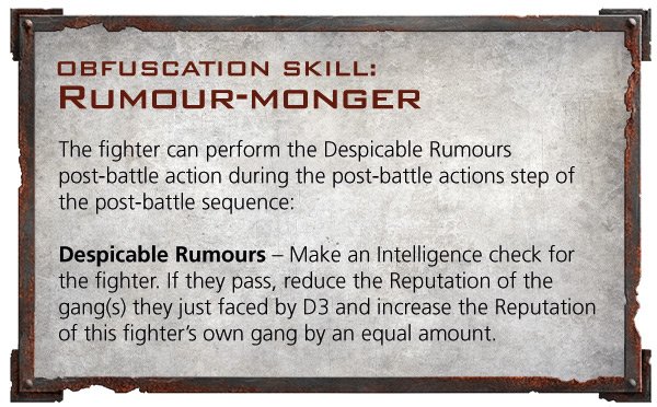 Rumor-Monger are going to be great for my gang. Getting an extra edge in being able to choose the scenario with Fake Out is a life-saver in making sure that I’m not mowed down in a stand-up deathmatch, and