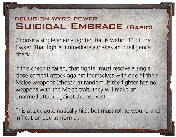 Psychoteric Choir. When casting a Whisper, each friendly (non-engaged) fighter within 3” increases the range of the power by up to +3”, and increases the difficulty of resisting it by +1 each for the same. Need a little bit more range to drive an enemy insane, or worried that they might be smart enough to see through your tricks? Huddle up with a few of your fellow weirdos, and soon your target will be gibbering along with you.