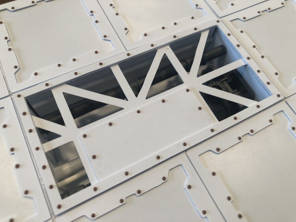 Next, I pull out some rivets, and for these I use .050” rivets made by Tichy Train Group. I trim the rivet off the sprue (very carefully) and lightly stab the rivet with an X-acto. I dip it in glue and place it carefully where I want it. For this, I match what I do on the rest of my floors.