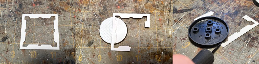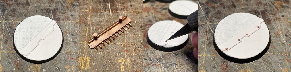 My first step was to measure the tops of the bases and draw them in Adobe Illustrator. When I need to make bases, I grab my materials, .020” styrene and Plastruct Diamond plate, load them into the Cricut and cut all the tops I need. I generally cut one of each with which I make two bases. Next I grab a ruler and slice the plain styrene top in 2 pieces and use one of those as a guide, placed on top of the diamond plate to cut it, to get perfectly sized pieces. Then I glue them on top of the base.