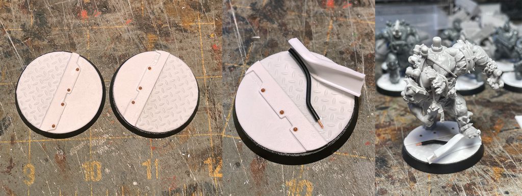 For this base example, I’m making a base for my Goliath ‘Zerker, which needs something for him to stand on. I used a piece of Evergreen ¼” I-beam which I twisted and hacked at the ends to add some damage. I added a chunk of wire and it’s good to go.