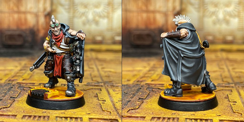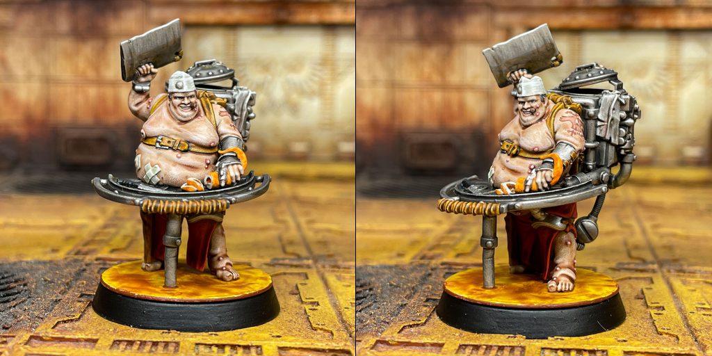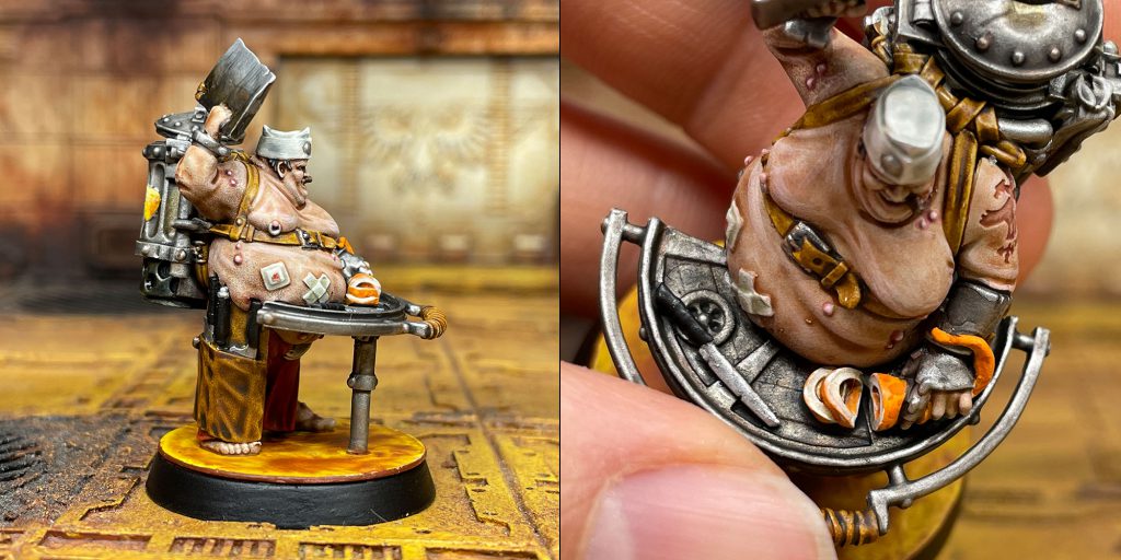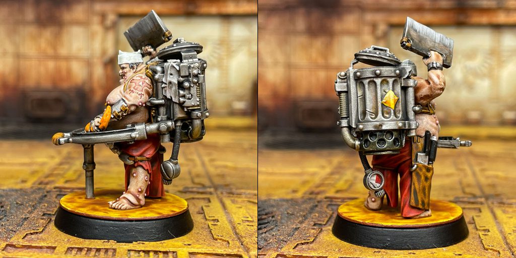 For the Slopper, I added some highlights to the skin with a mix of Guilliman and white. Because he has so much skin, I felt it needed a little boost. I highlighted his buboes (pimples?) with white and then glazed them with a 25/75 mix of Volupus Pink and Contrast Medium. I added some of this to his brand/tattoo as well. His pants were painted red in the same method as the Scabber as were the straps. The tentacle was painted white and then I put a coat of Old Citadel Fiery Orange on the outside. I added some spots with Citadel Vermin Brown. I used lots of layers to build up grime on his backpack cooker, with Nuln Oil, Snakebite Leather, Army Painter Soft Tone, Black Templar, Vermin Brown, and Black. Very much a process by feel, slowly building it up. I added some of this same process to his cutting board, to make it feel old and used. His hat was painted in the same way as the Scabber’s hair, but with a highlight of white on top.
