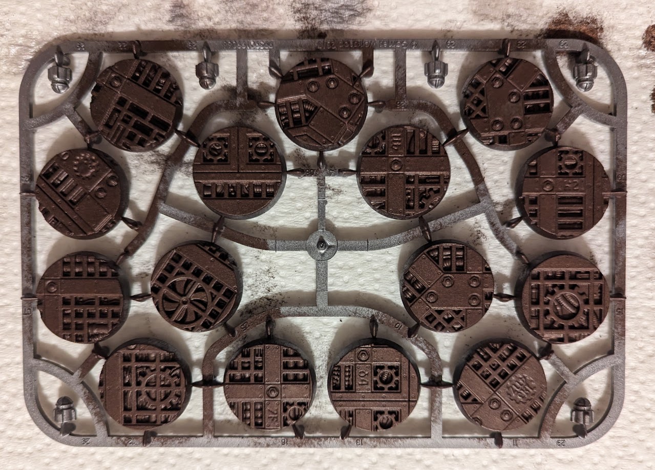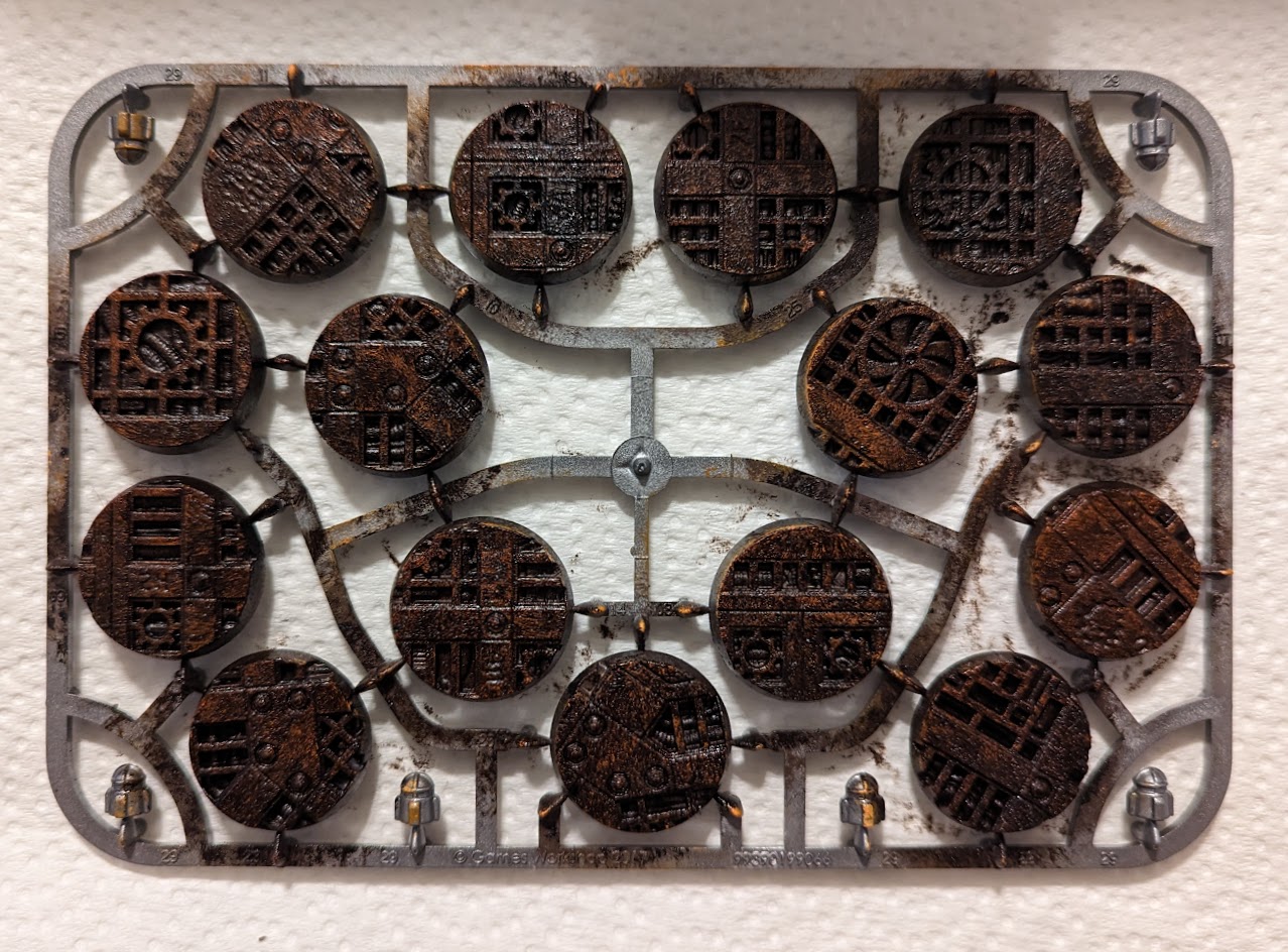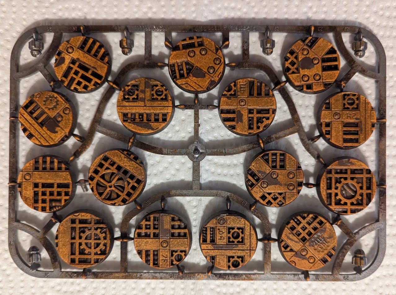 Start by applying a metallic spray undercoat. In this case I used Army Painter Gunmetal because that's what I had lying around, but any metallic spray will likely work fine. You can also use something like a brown primer if you would prefer to have things look really corroded.