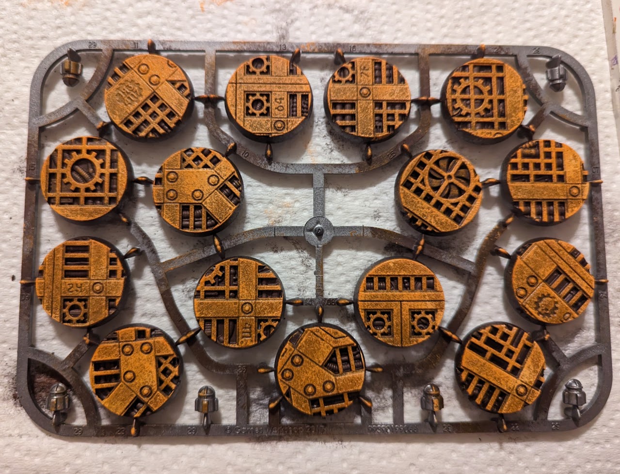 The final step is optional, but adds a little more contrast and weathering. Re-apply the oil paint, but this time wipe it off with a dry towel. This prevents the acrylic layer from coming off, but more aggressively attacks the metallic wax layer. This also can really accentuate the details, as shown in how must more distinct the numbers and the recesses around the depressions and bolts appear. Put the piece somewhere to dry and you're done.