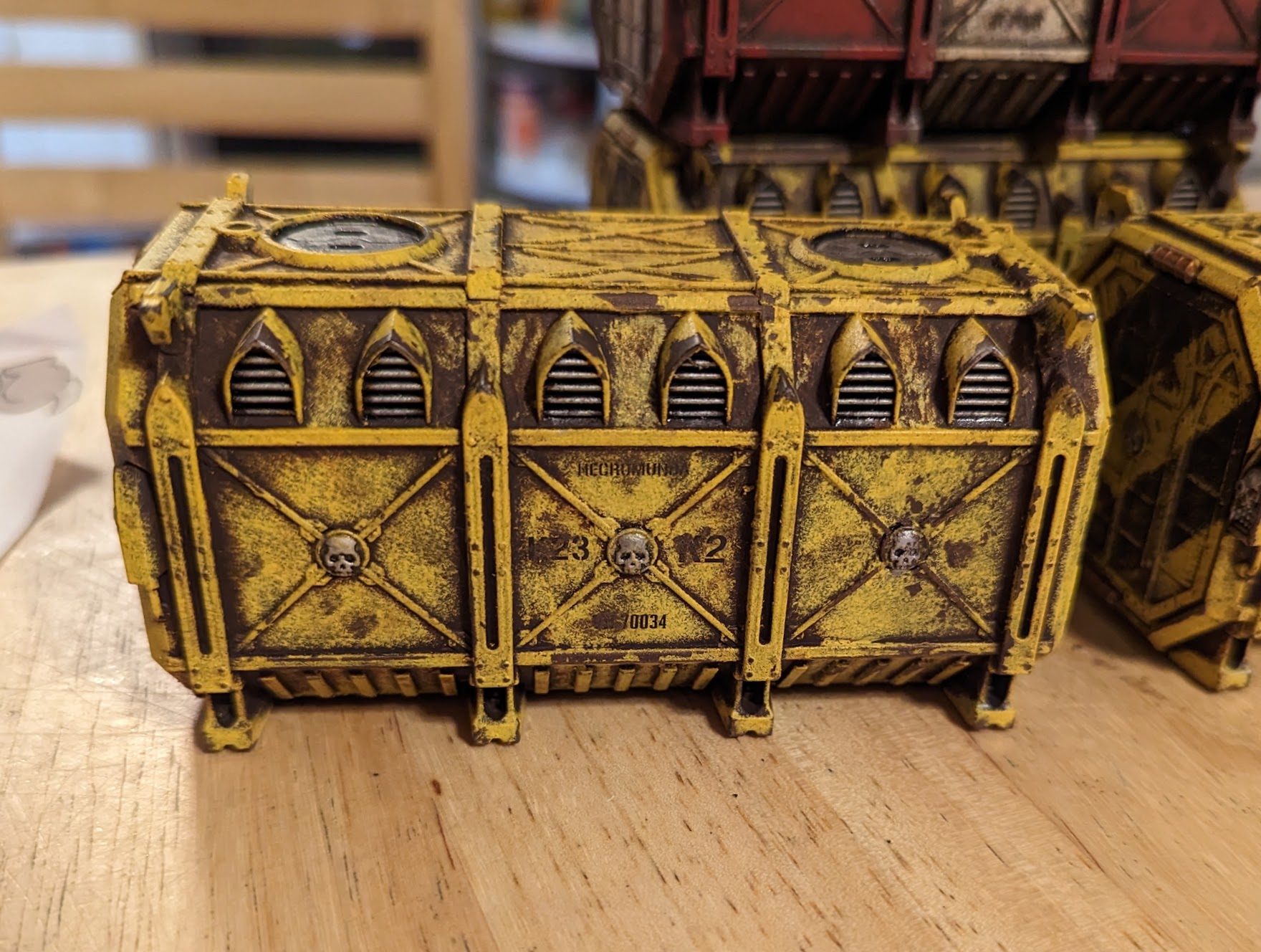Wax-based metallic paints like Rub n' Buff are great for painting large quantities of terrain, and recently I decided to experiment with combining them with acrylics in order to paint some Munitorium Armored Containers. Terrain is a great opportunity to experiment with different techniques, particularly since in the end you can always slap more paint on it and declare it weathered. In this case what started off as an attempt to play with water-mixable oils turned into a fun discovery about weathering and chemically incompatible paints.