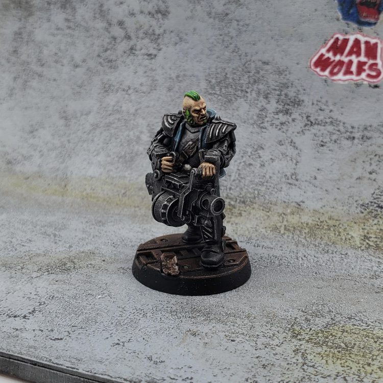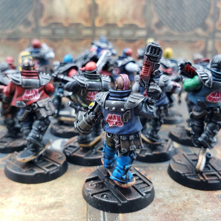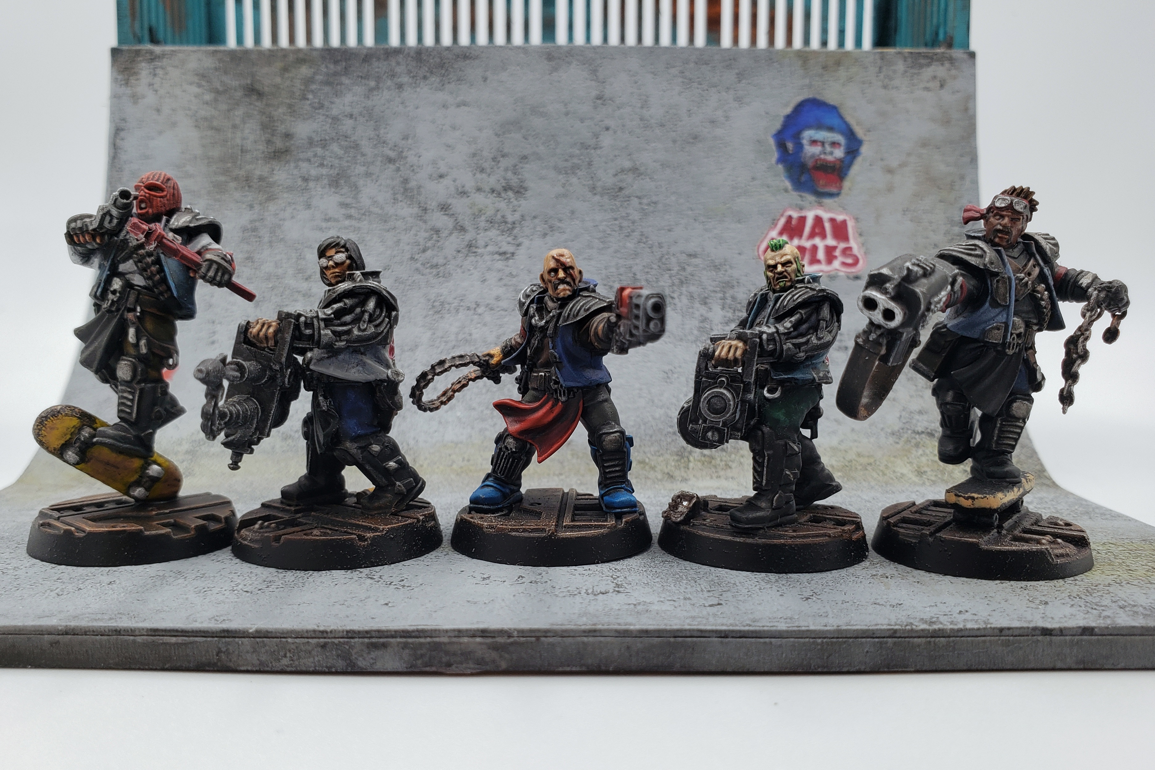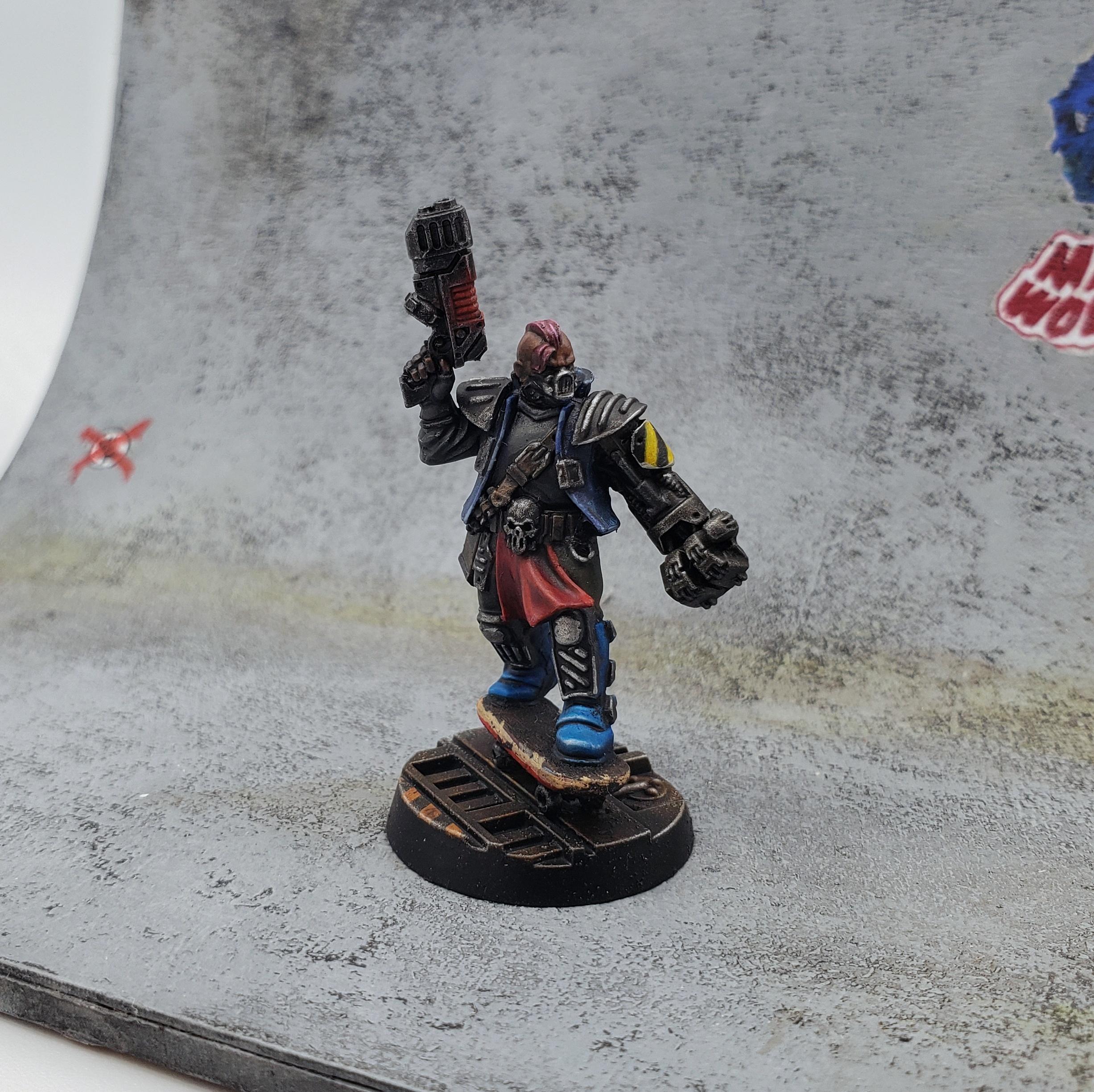 A few months ago I rewatched the movie Machotaildrop. There’s a scene with a big diorama of miniatures in a skate park, and it got me thinking about recreating that in Necromunda. I’ve played in two campaigns with a Nurgle Chaos cult gang, but I got the urge to try out a House gang for a change. The Manwolfs are a feral gang of skateboarders that show up and generally wreck shop in Machotaildrop, along with various shoe commercials and music videos. House Orlock already has cool vests and bike chain flails, so it was a perfect match!