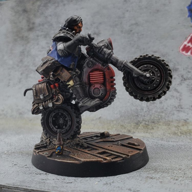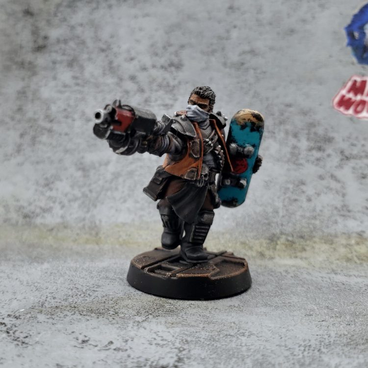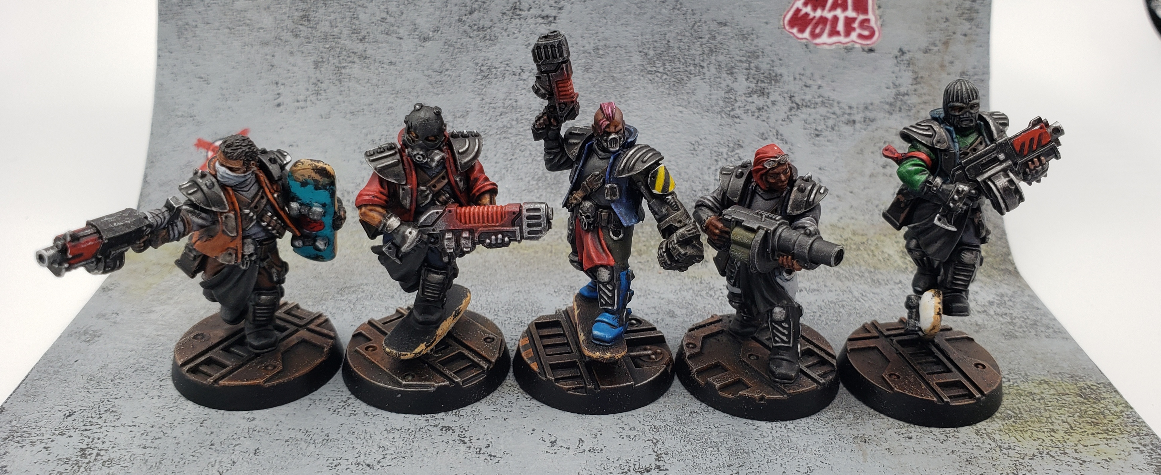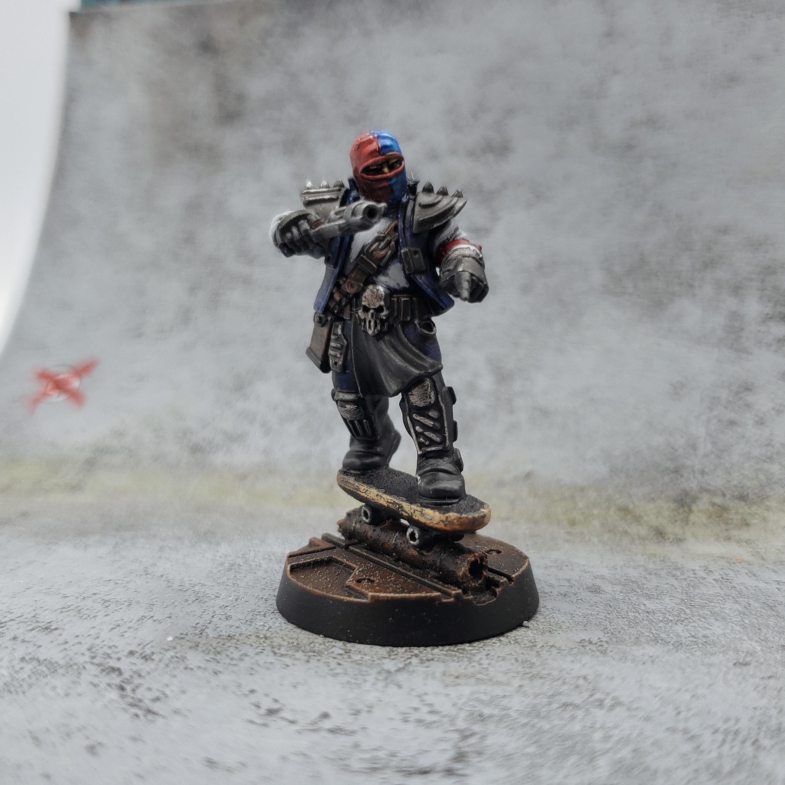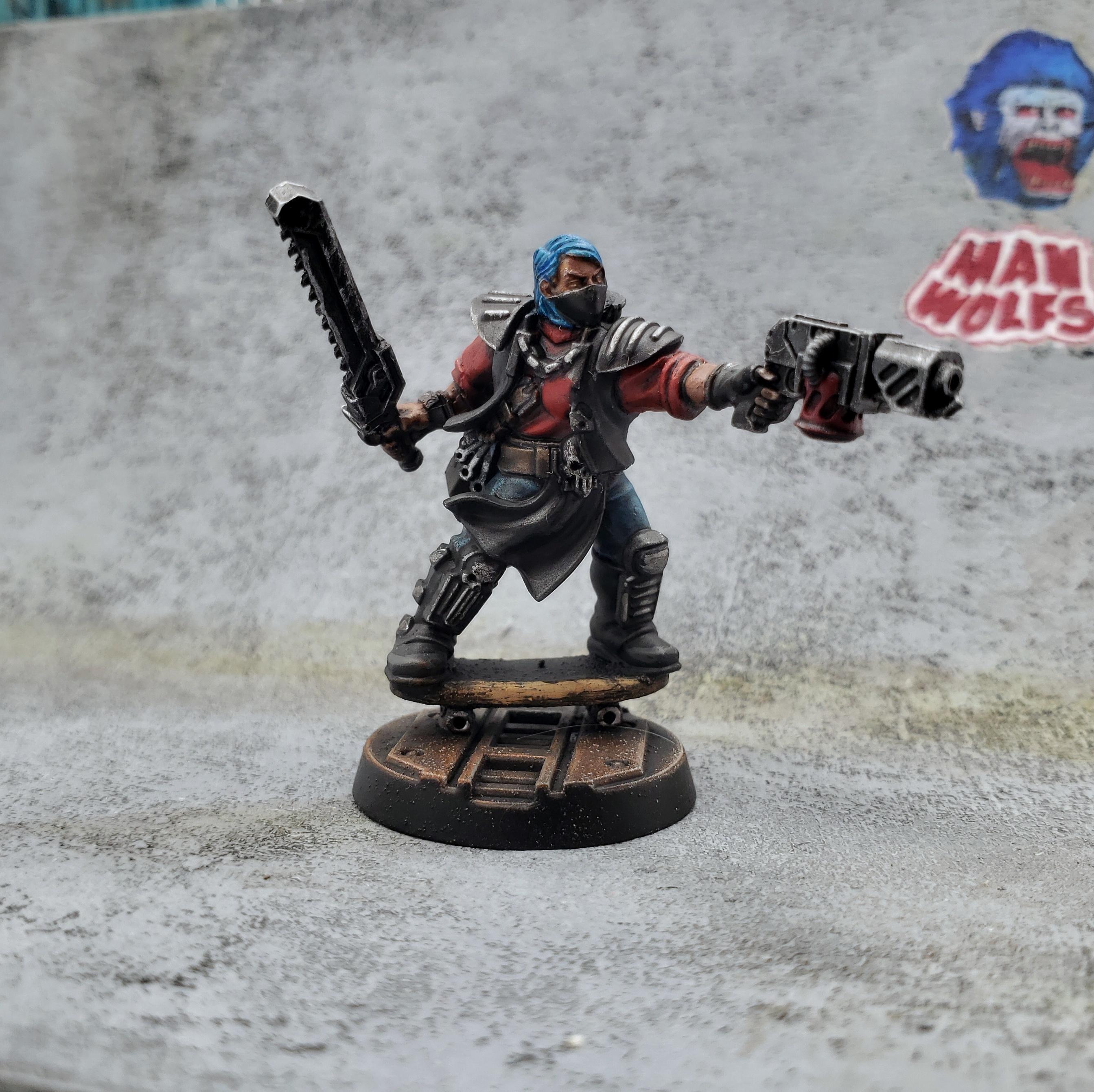 A few months ago I rewatched the movie Machotaildrop. There’s a scene with a big diorama of miniatures in a skate park, and it got me thinking about recreating that in Necromunda. I’ve played in two campaigns with a Nurgle Chaos cult gang, but I got the urge to try out a House gang for a change. The Manwolfs are a feral gang of skateboarders that show up and generally wreck shop in Machotaildrop, along with various shoe commercials and music videos. House Orlock already has cool vests and bike chain flails, so it was a perfect match!