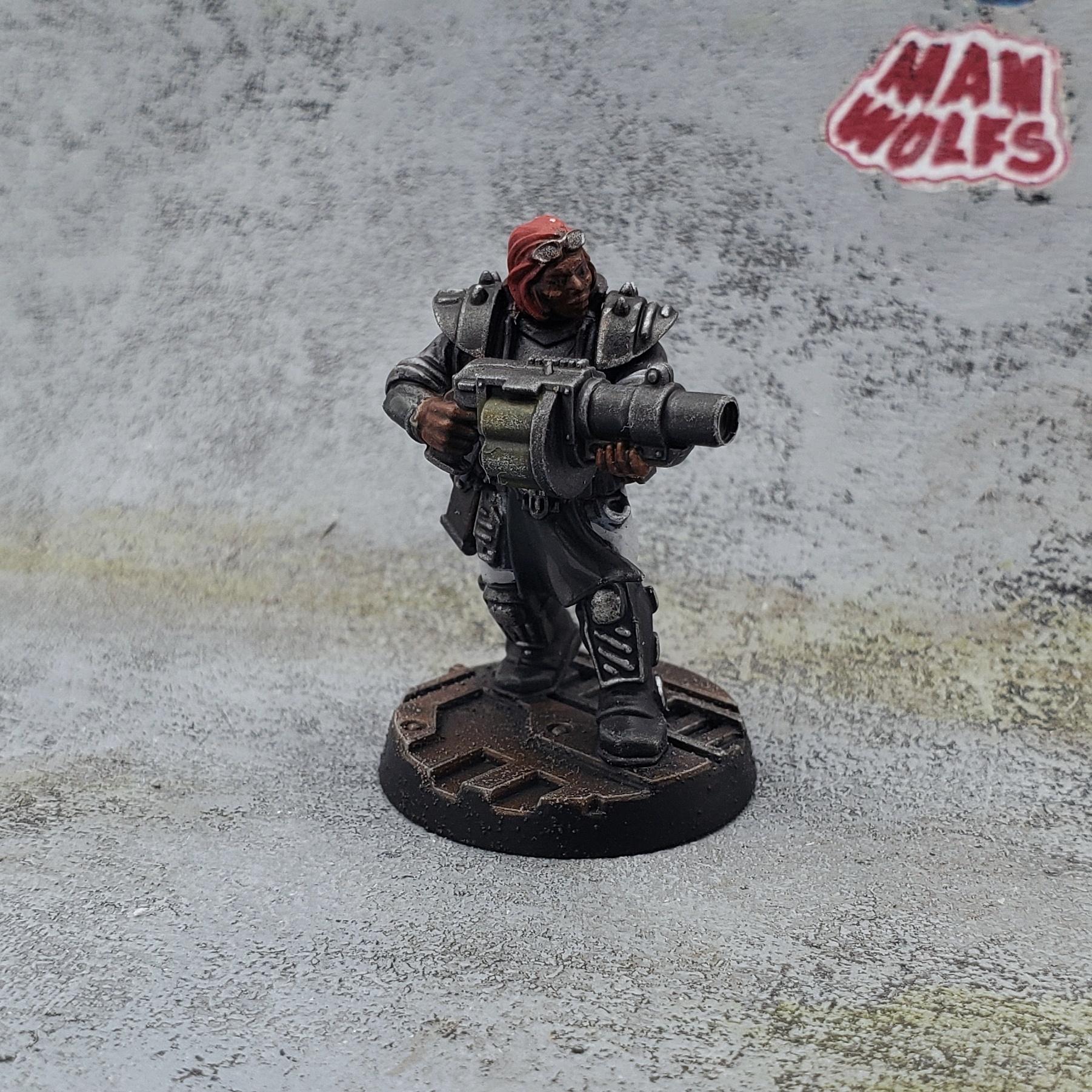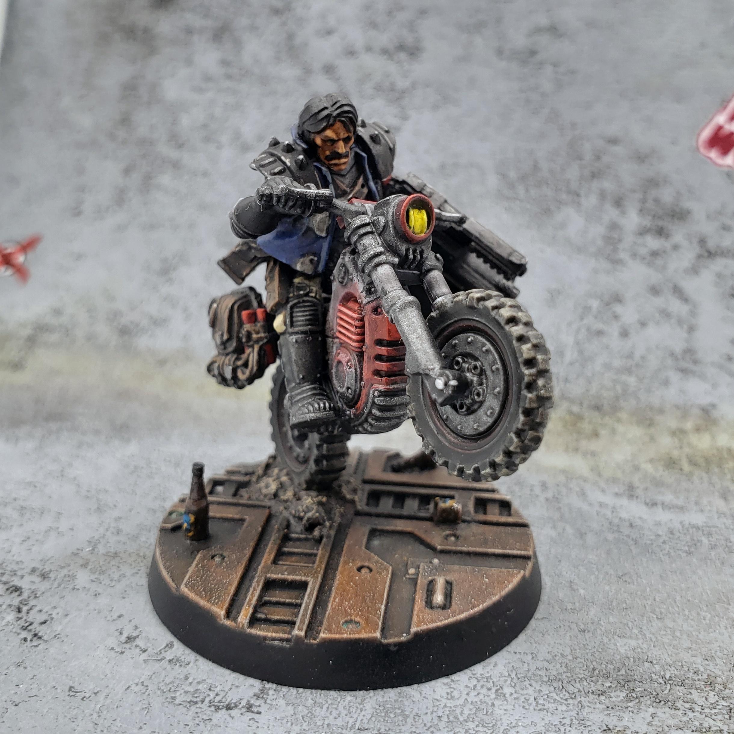 The basecoats are all GW contrast & Vallejo Metal Color paints over a heavy zenithal. Everything got a coat of gloss varnish and Testors black enamel stain, making sure to keep the majority of the grime in the recesses and panel lines. Boards and vests got their transfers, and some highlights got added here and there.