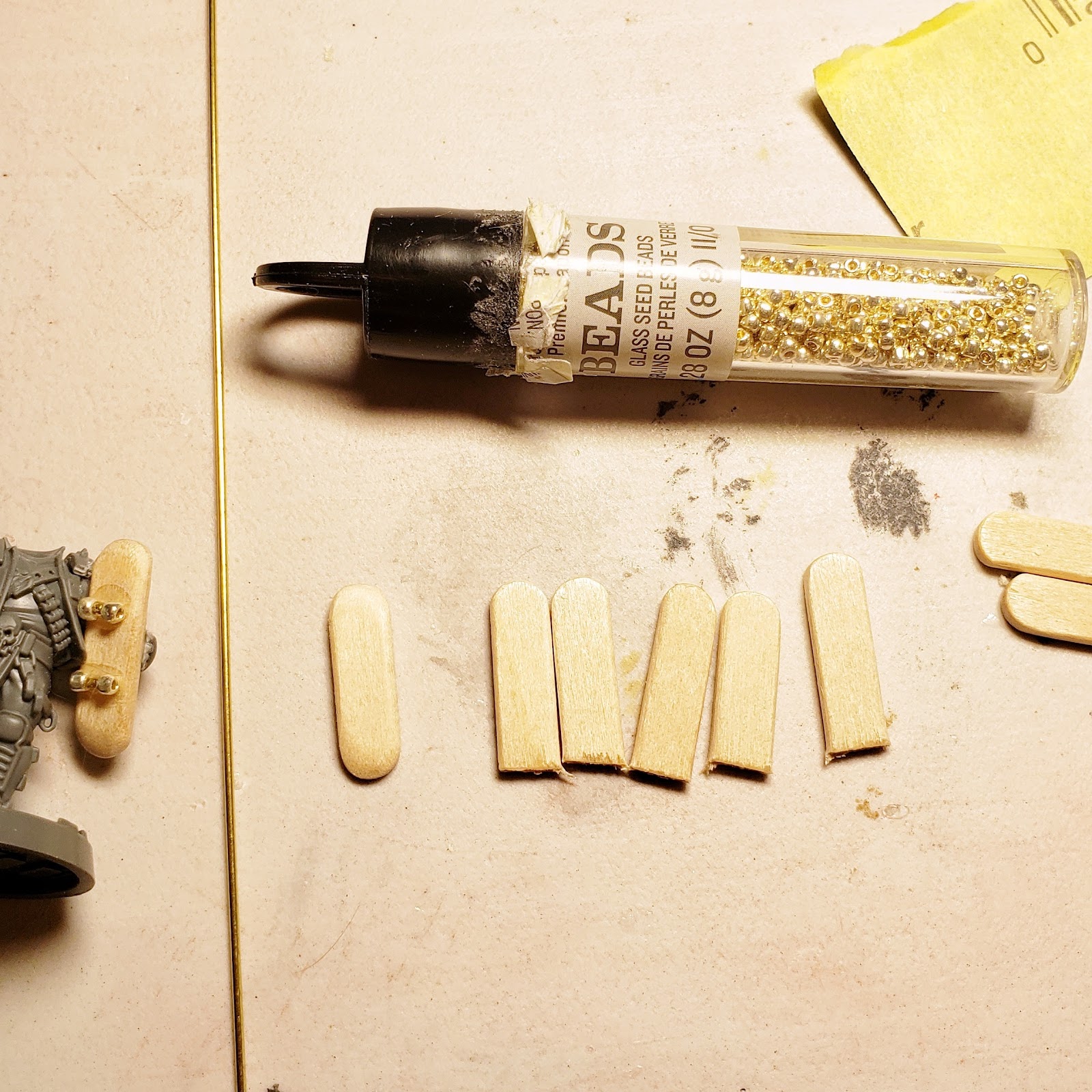 When I first got the idea to do a skateboarding Necromunda gang, I assumed that there would be some easy bits to pick up… but I couldn’t find anything the right size. Without boards to buy, I whittled my own out of small craft sticks. The trucks and wheels are made of brass rod and 11/0 glass beads. For the kickflip poses, I carved out a bit of a gap in the base and pinned it for stability. The skimask heads and some assorted other goodies are from Anvil Industries. My “lugger” cargo servitor is kitbashed from a Genestealer Cult Atalan Jackal Bike and a legion heavy bolter.