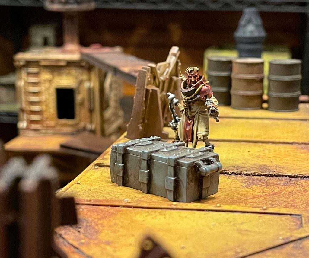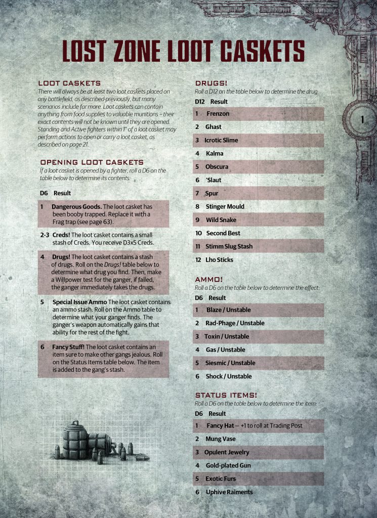 Cody: Also, keep in mind that loot caskets are a bit hard to get into. Not only do you have to send your ganger into most likely a dangerous position, but you also need to spend an action and pass a characteristic check. It’s not a foregone conclusion! So we felt that there should be a greater reward than blowing up, creds barely worth noting, or a lackluster ammo cache.
