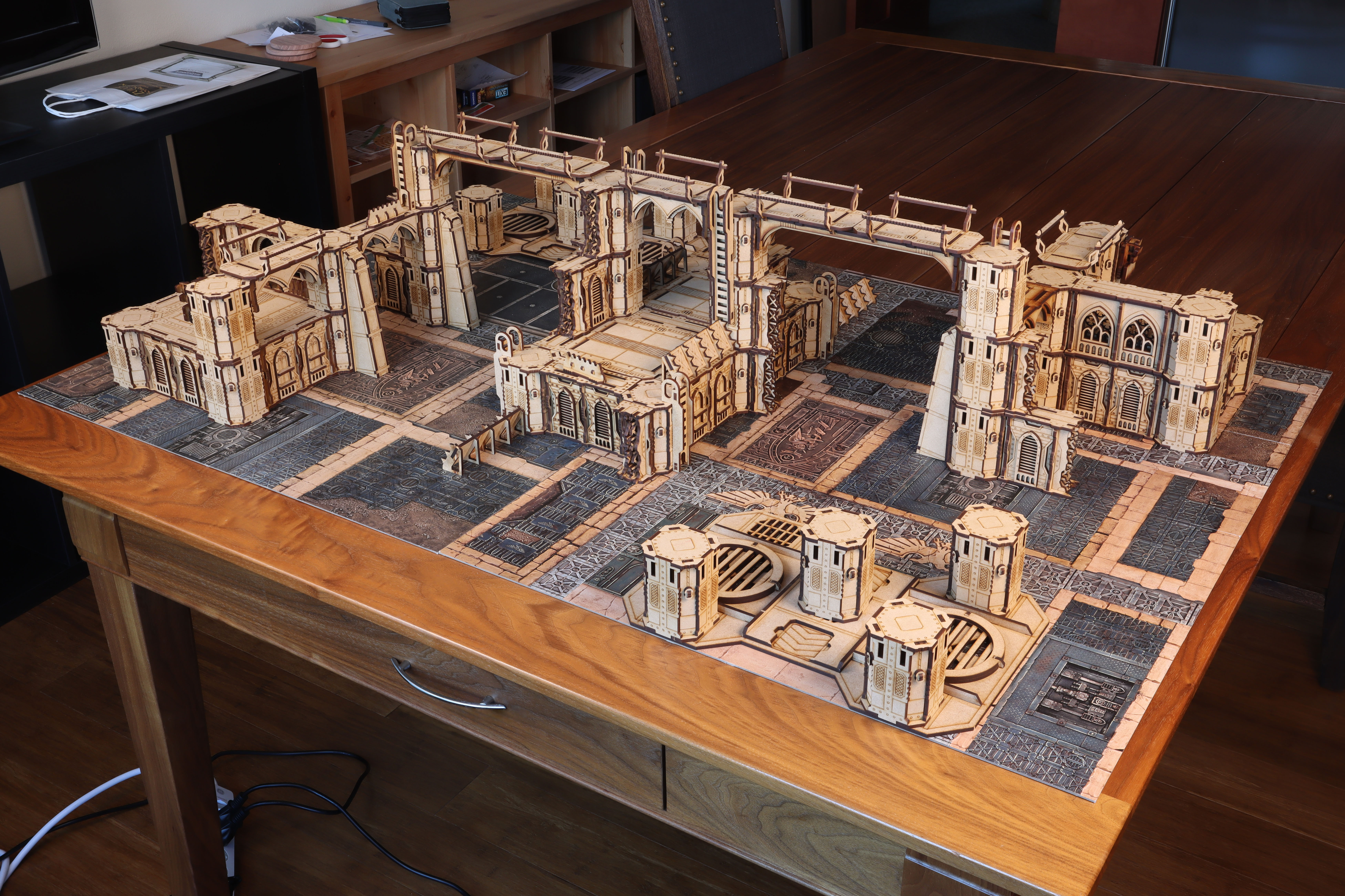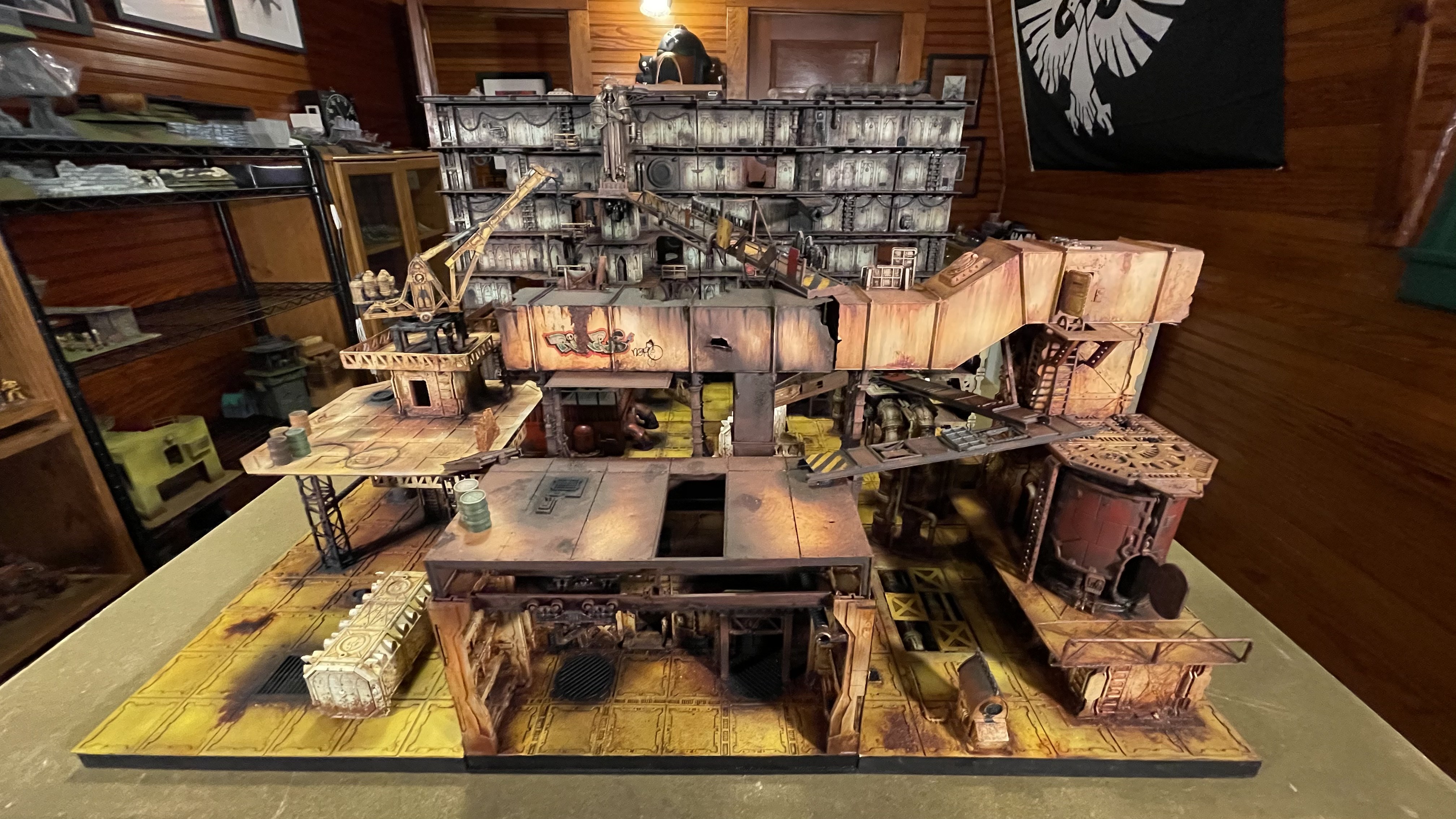 The cranes, girders, and scaffolding that support the spires provide a vantage point to watch over the underhive.